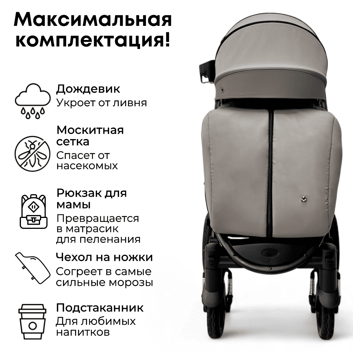 В комплект входят: рюкзак для мамы, дождевик, чехол на ножки с центральной молнией, москитная сетка и подстаканник.