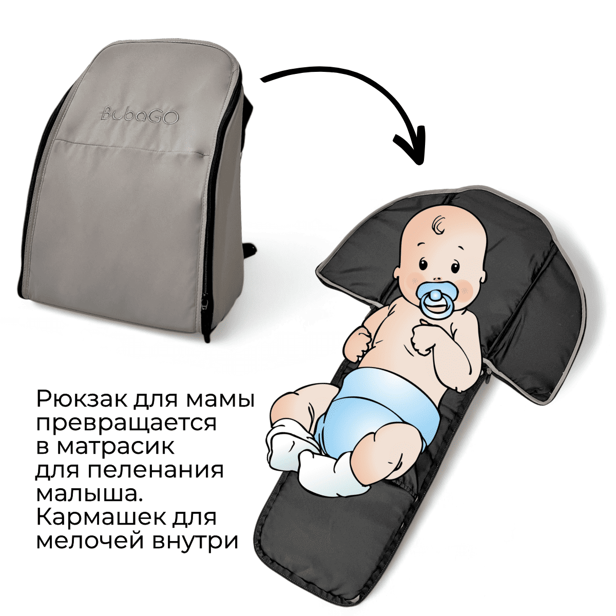 Рюкзак-сумка крепится на ручку и трансформируется в пеленальный матрасик — фирменное удобное решение BubaGO.
