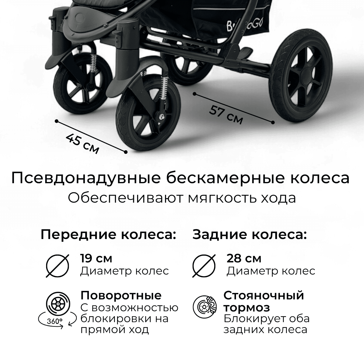 Задние колёса 28 см, передние 19 см из бескамерного полиуретана — хорошо проходят бордюры и неровности.