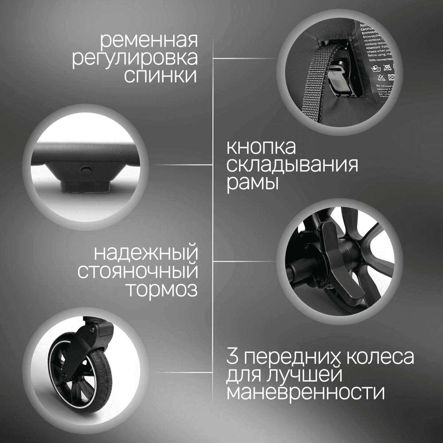 Полиуретановые колёса с протектором: передние 18 см, задние 25 см — плавный ход по плитке, бордюрам и лёгкому бездорожью.