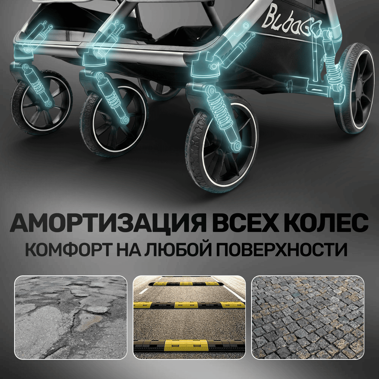 Уникальное шасси: три передних колеса для лучшей устойчивости и манёвренности на поворотах и неровностях.