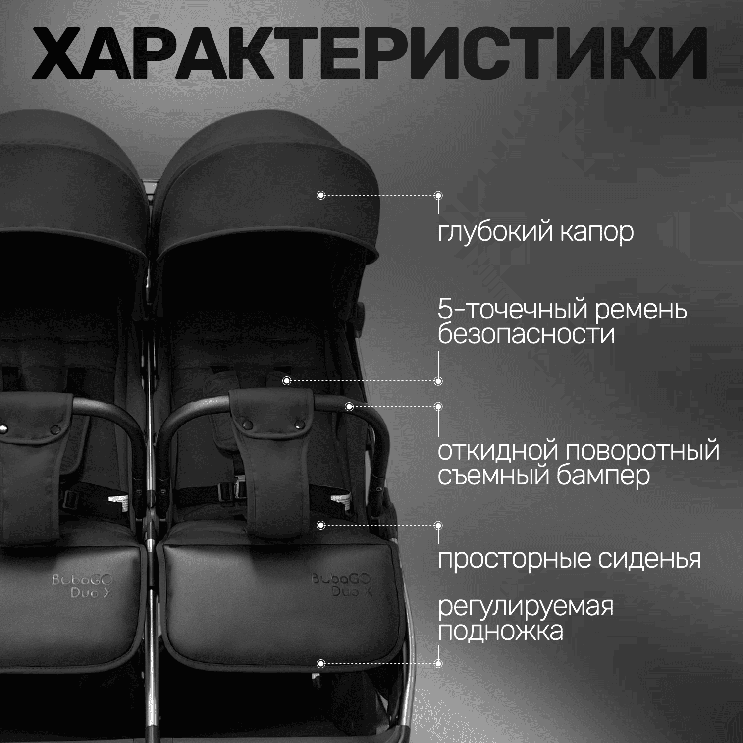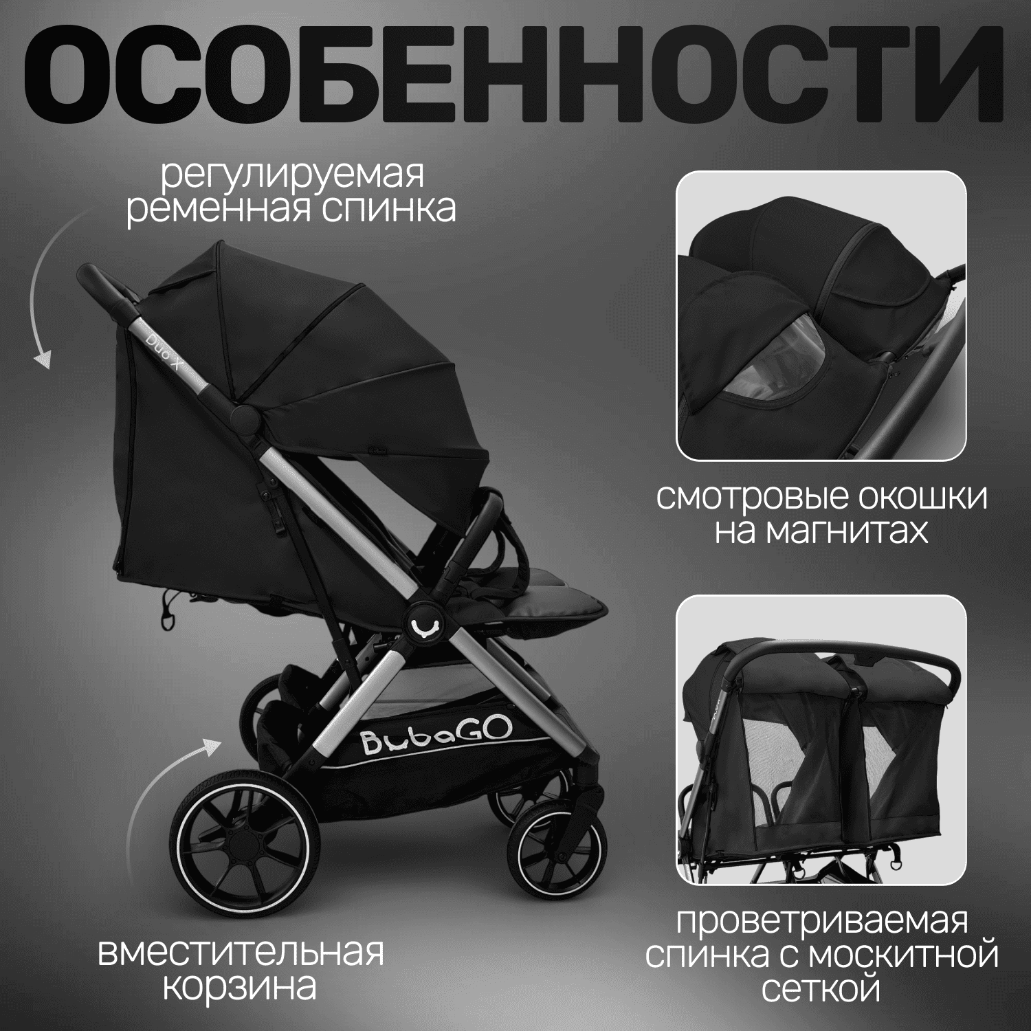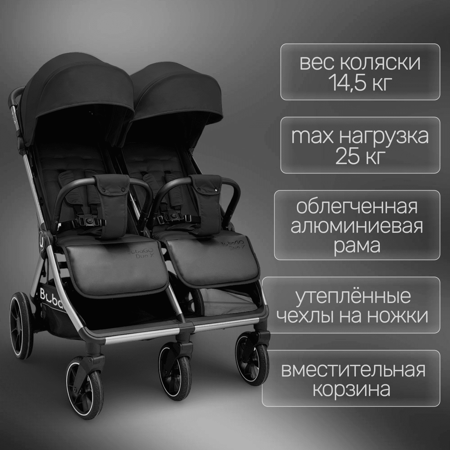 Прогулочная коляска для двойни BubaGO DUO X создана для активных родителей, сочетает удобство управления, продуманную эргономику для двух малышей и компактное автоматическое складывание.