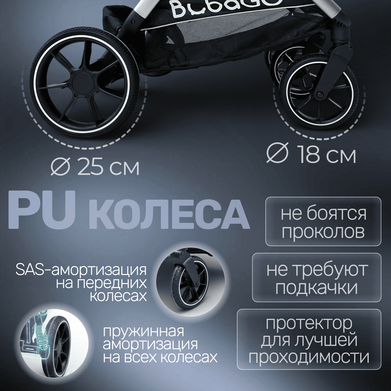 Полиуретановые колёса с протектором: передние 18 см, задние 25 см — плавный ход по плитке, бордюрам и лёгкому бездорожью.