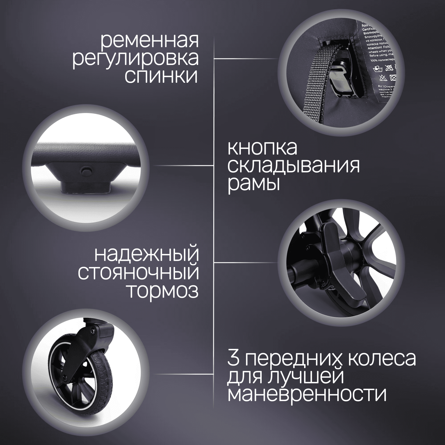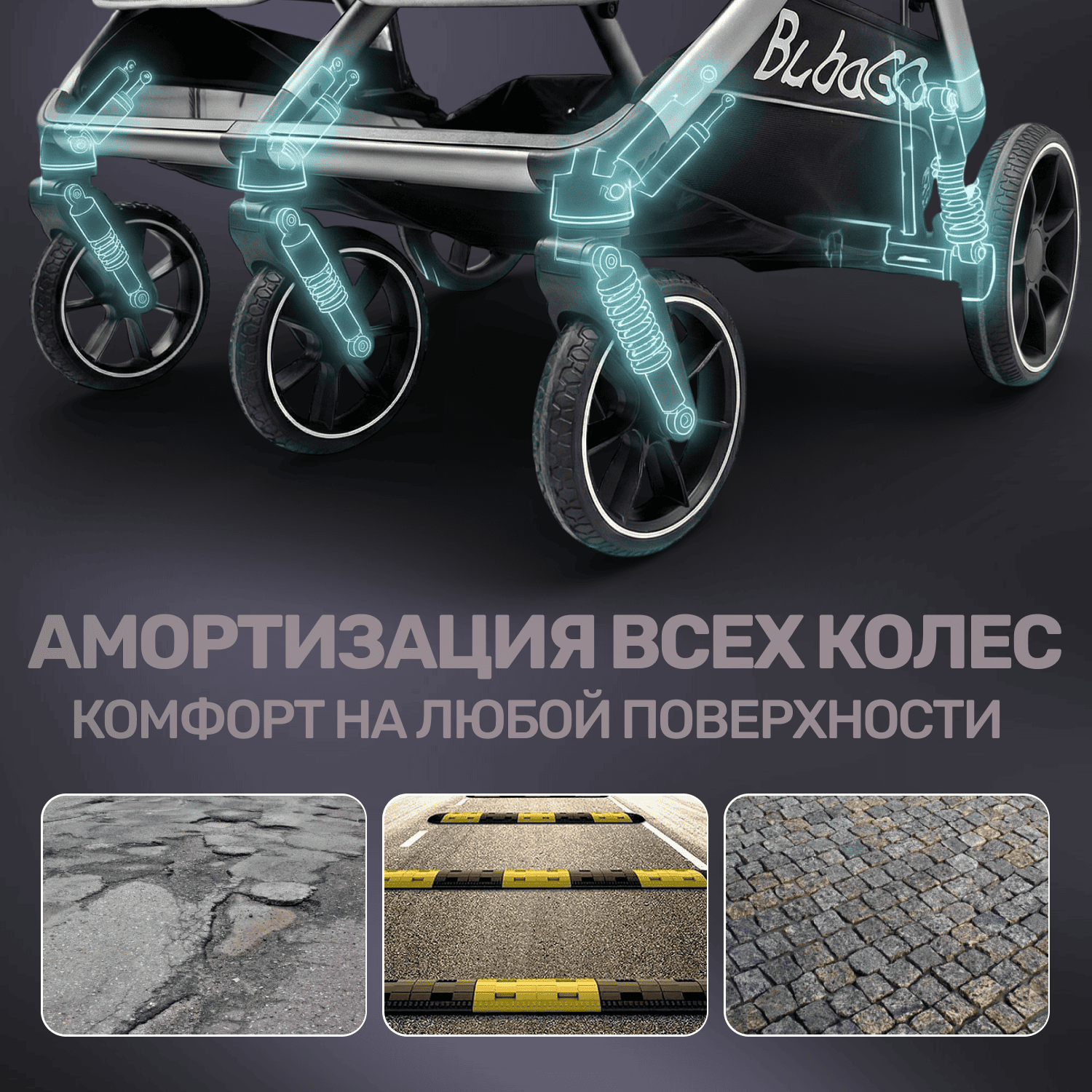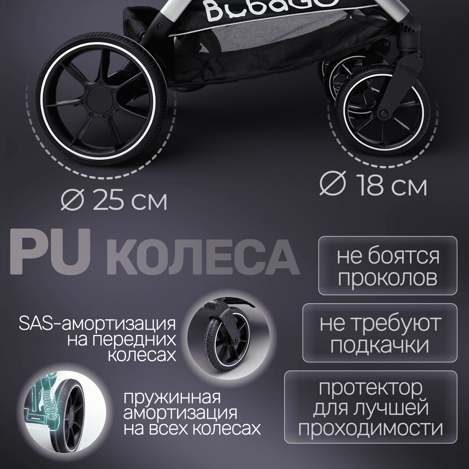 • Полиуретановые колёса с протектором: передние 18 см, задние 25 см — плавный ход по плитке, бордюрам и лёгкому бездорожью.