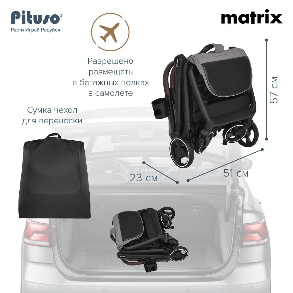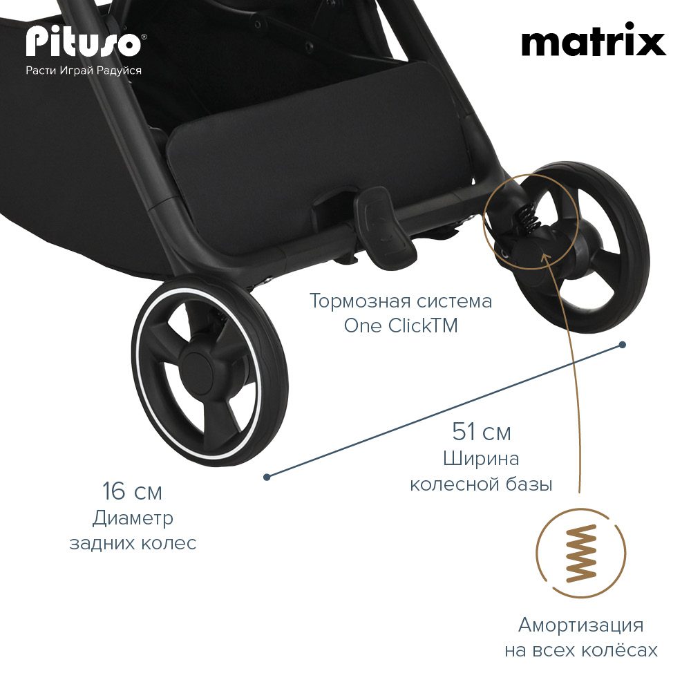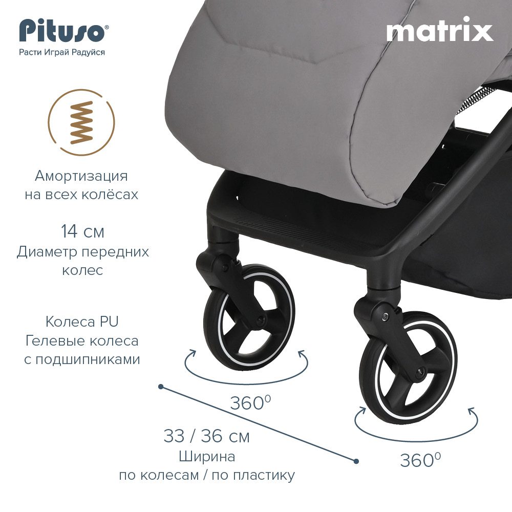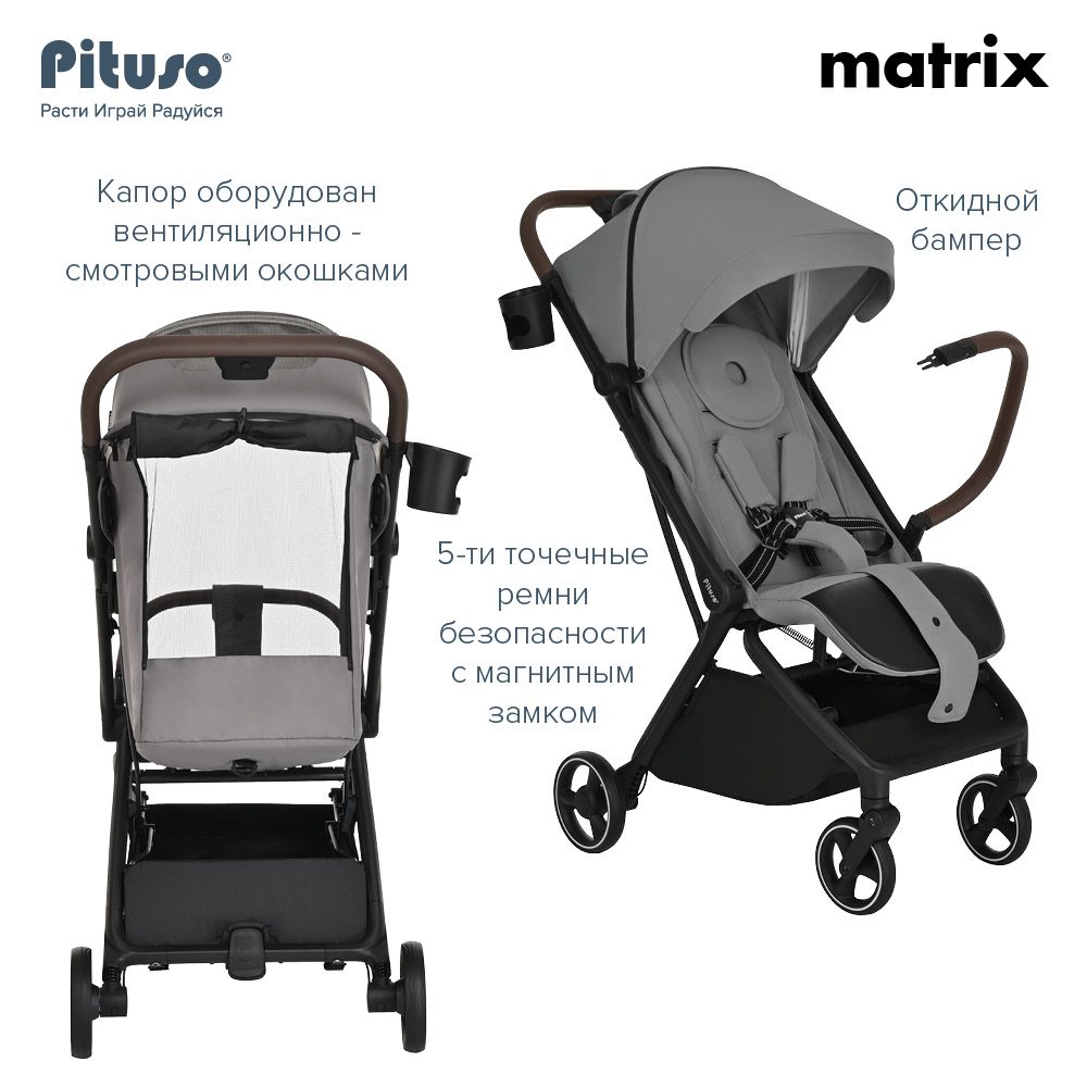 Прогулочная коляска Pituso Matrix – ультралегкая городская коляска с мягким ходом и высокой маневренностью. Она весит всего 7,9 кг, выдерживает нагрузку до 22 кг и рассчитана на детей от 6 до 36 месяцев. Благодаря компактному сложению одной рукой и легкому алюминиевому шасси коляска удобна для ежедневных прогулок и путешествий.