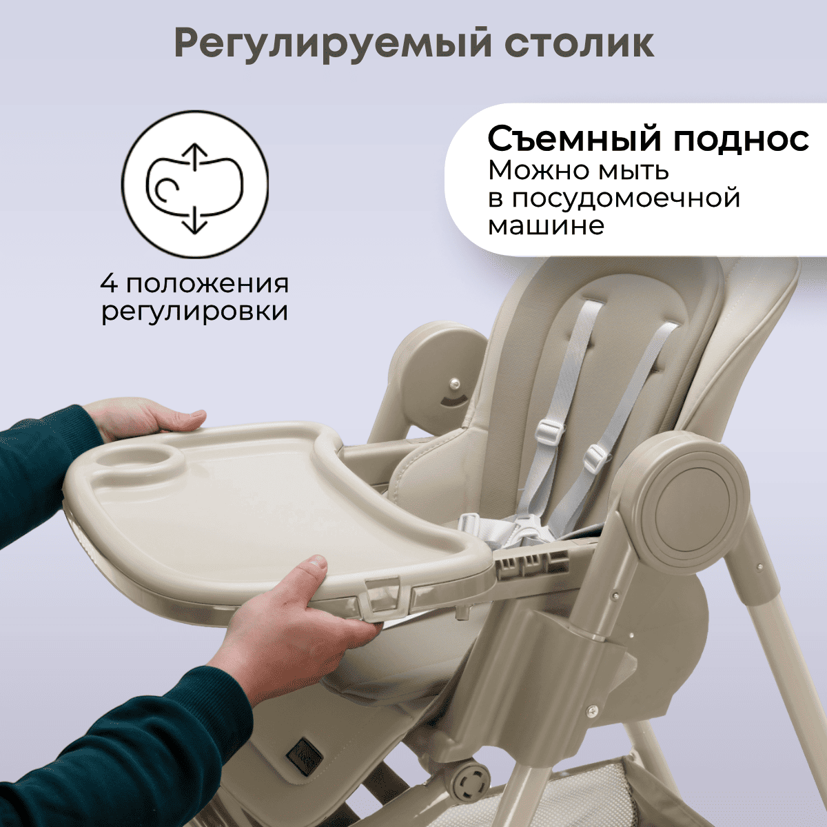 Поднимающиеся подлокотники позволяют придвинуть стульчик максимально близко к столу и сохранить контакт с семьёй во время еды.