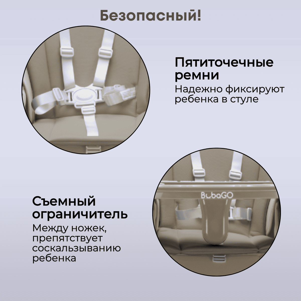 Пятиточечные ремни безопасности и съёмный ограничитель между ножек надёжно фиксируют малыша и защищают от сползания и падения.