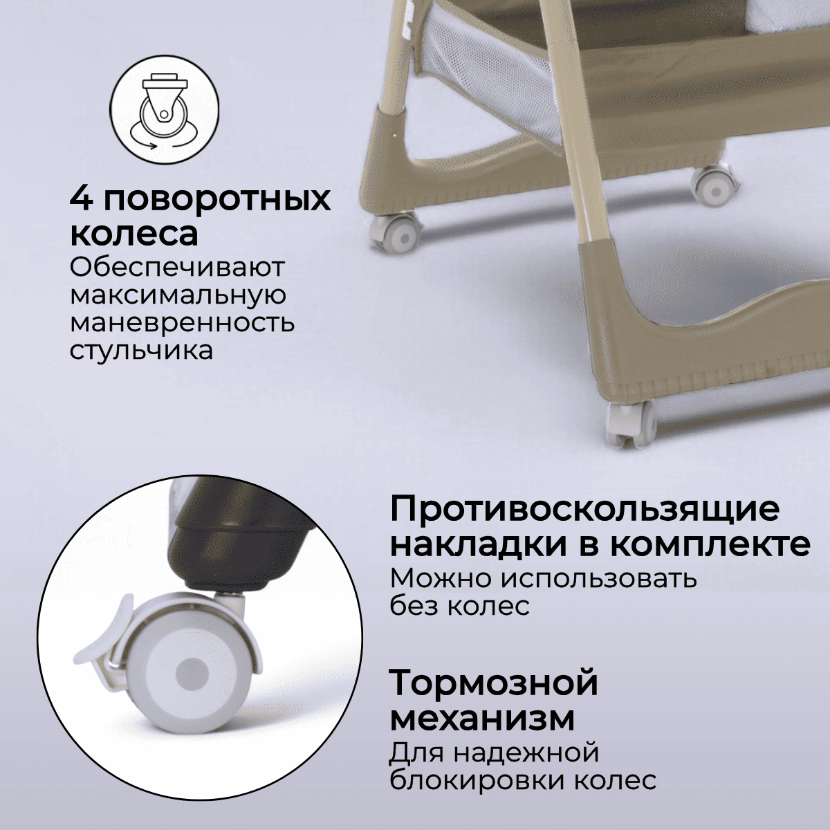 При снятых колёсах стульчик устойчиво стоит на ножках с противоскользящими вставками.