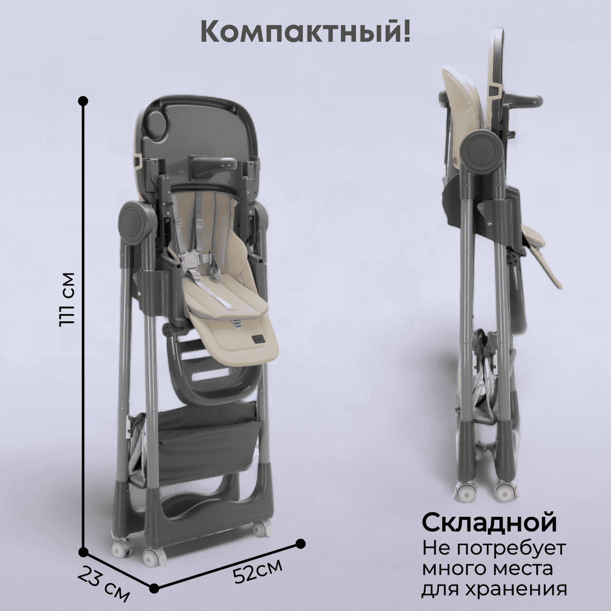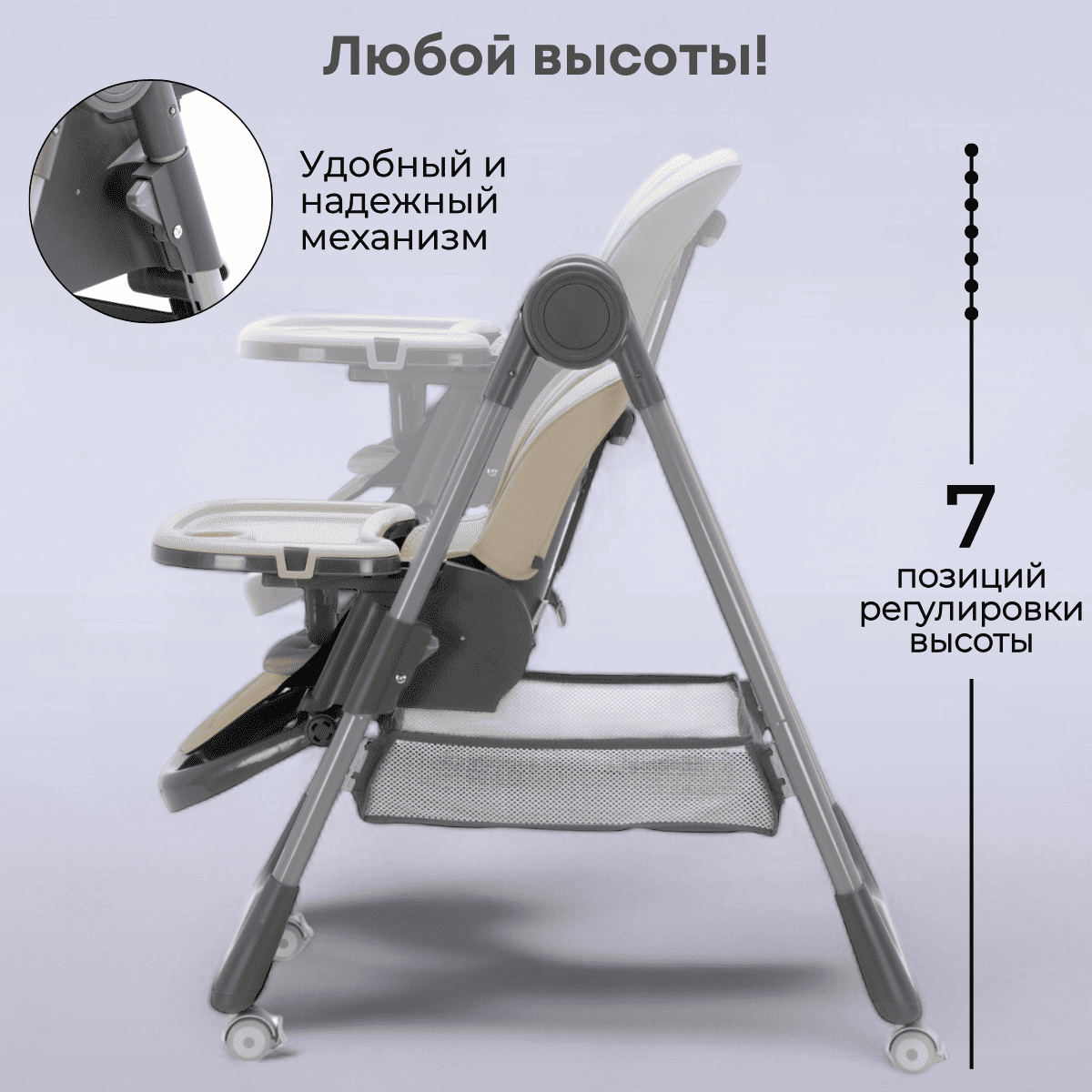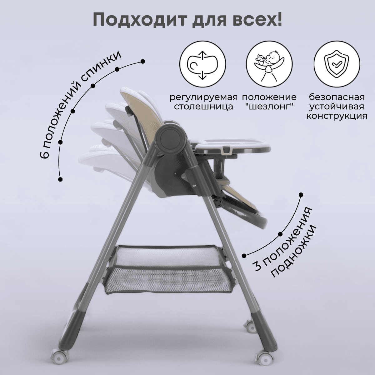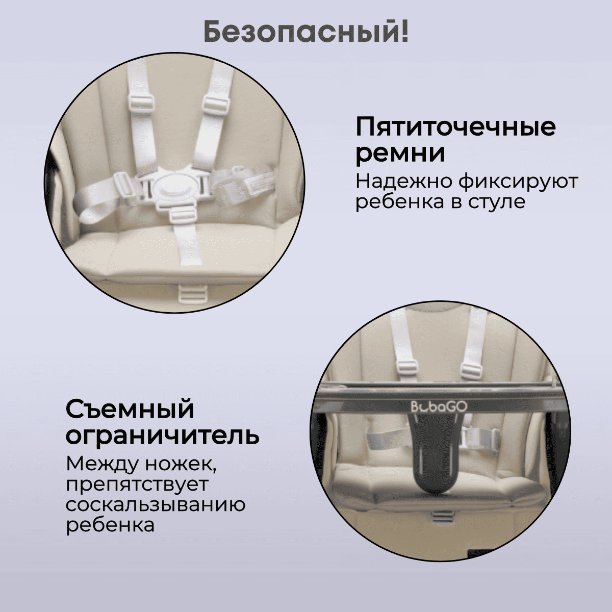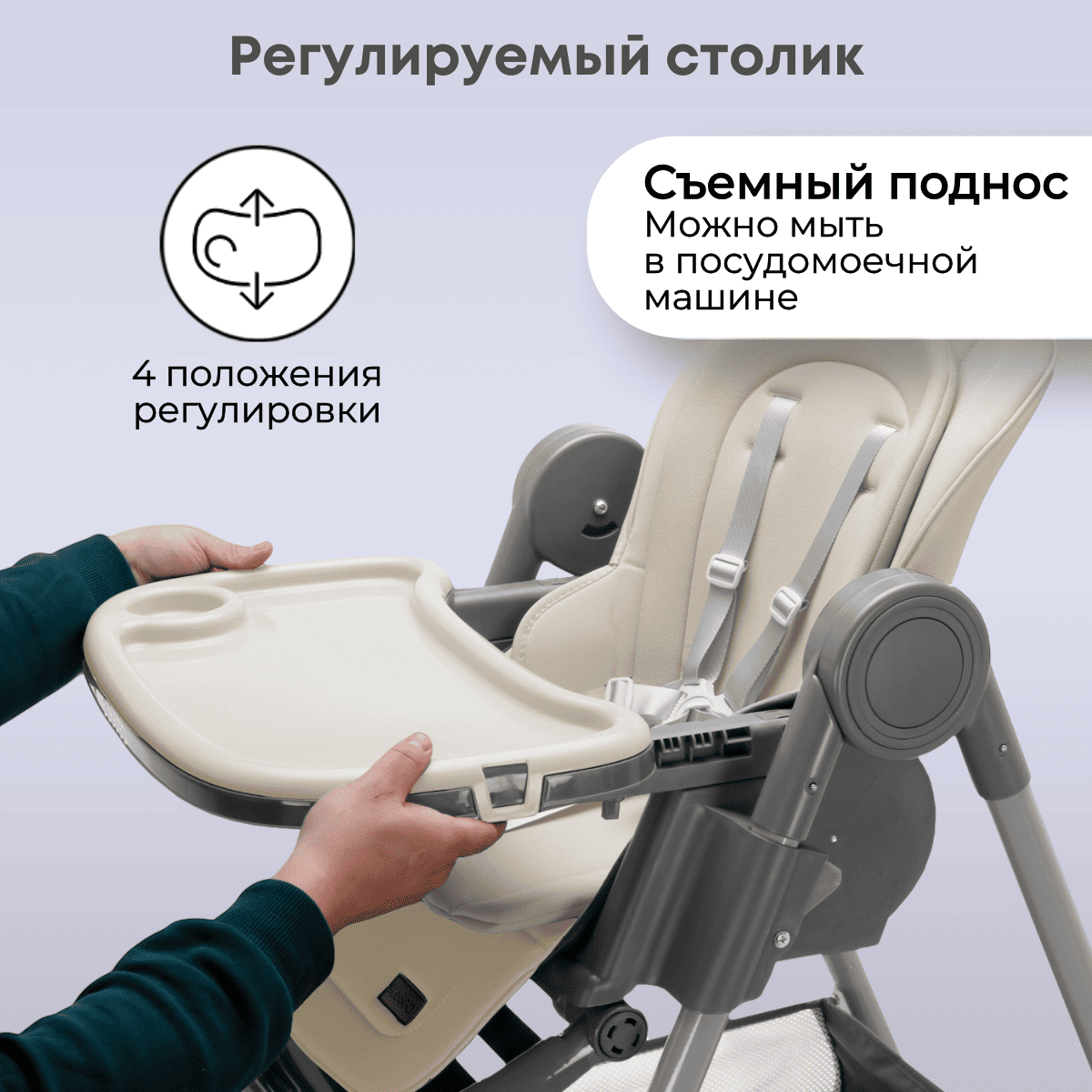 Двойной разборный столик делает модель универсальной: верхний уровень удобен для кормления, нижний — для игр и творчества. Съёмный поднос легко моется и подходит для посудомоечной машины, а паховый держатель на нижней части столика помогает ребёнку сохранять правильную посадку и предотвращает сползание. Внизу расположена вместительная корзина для игрушек и необходимых мелочей, чтобы всё было под рукой.