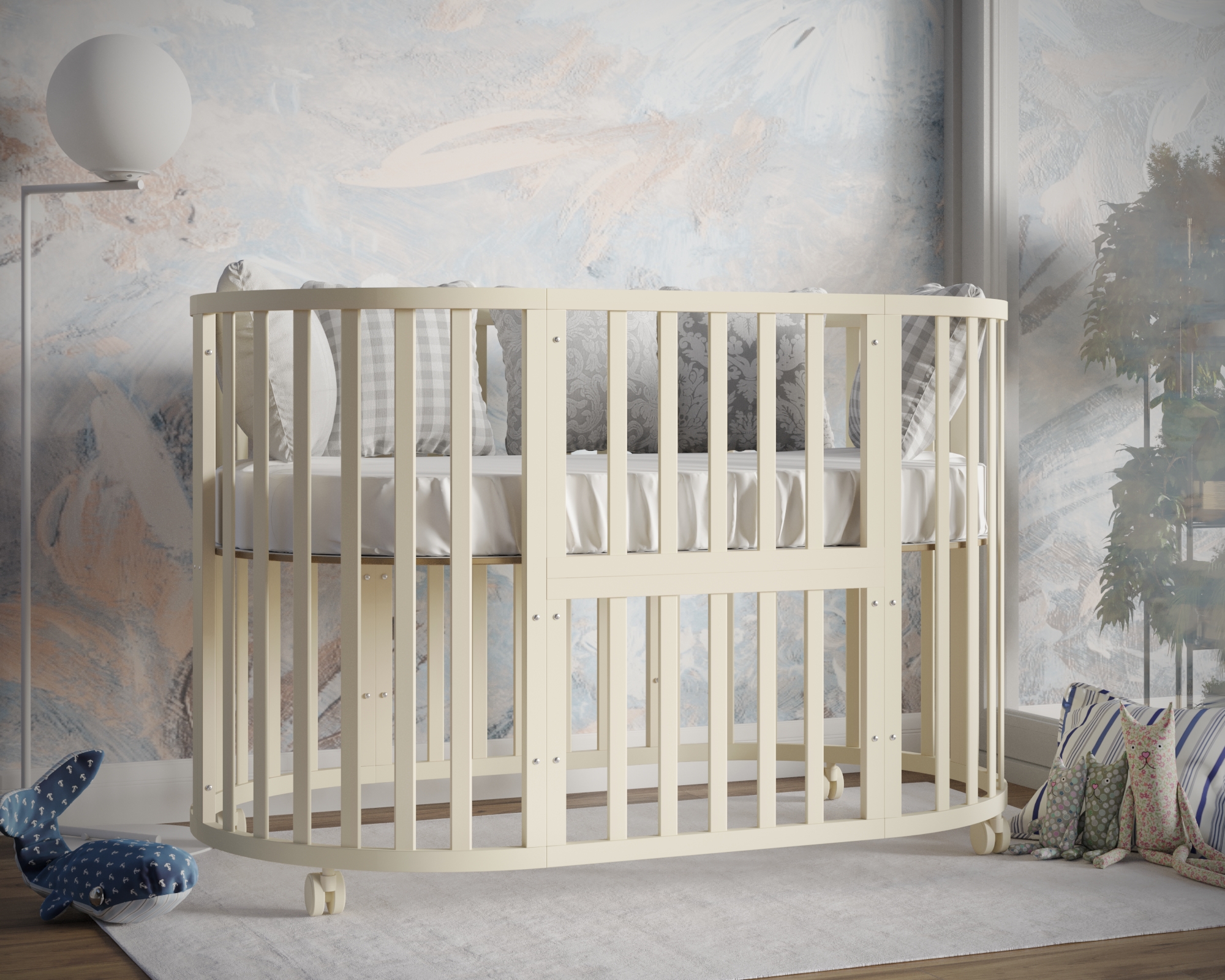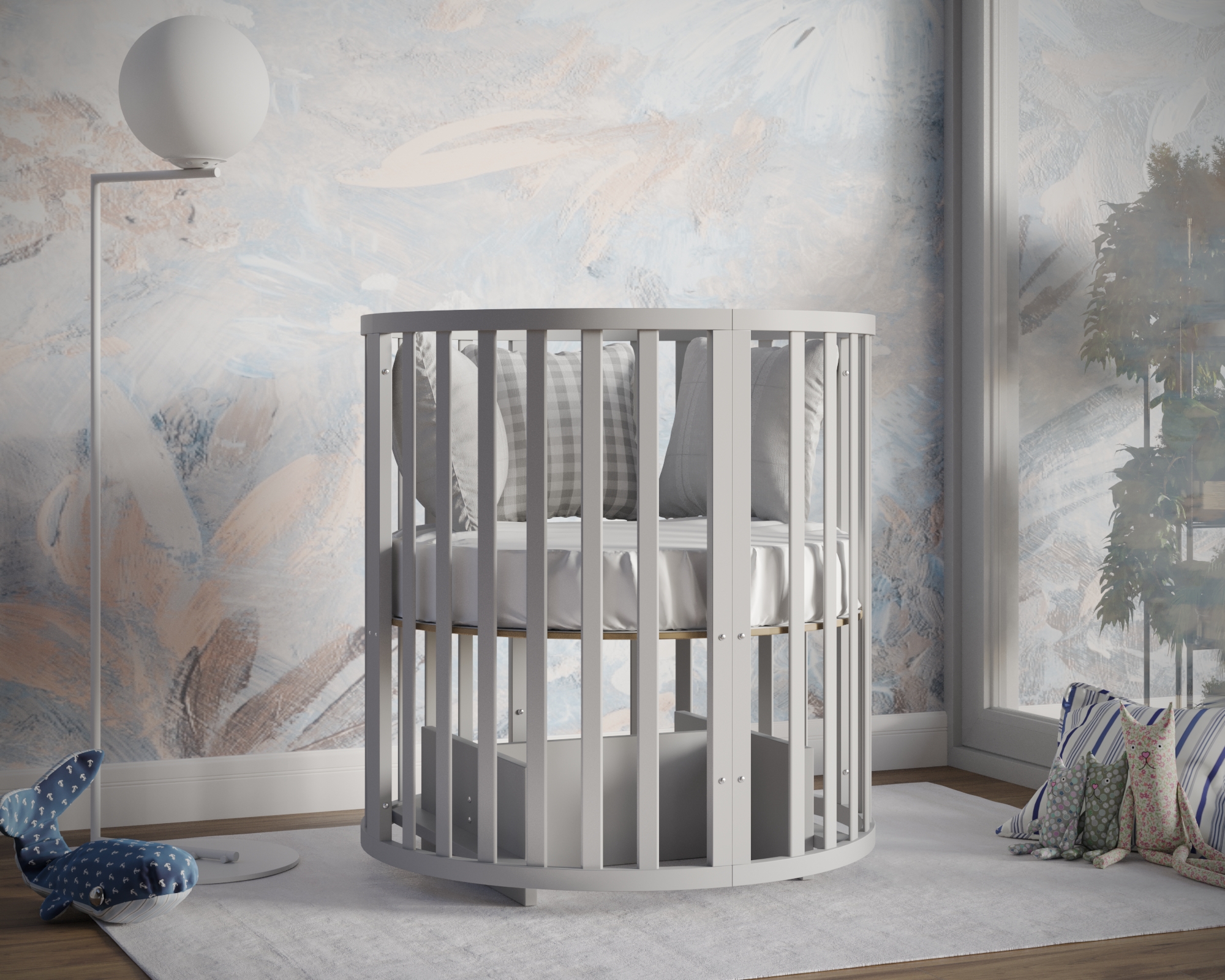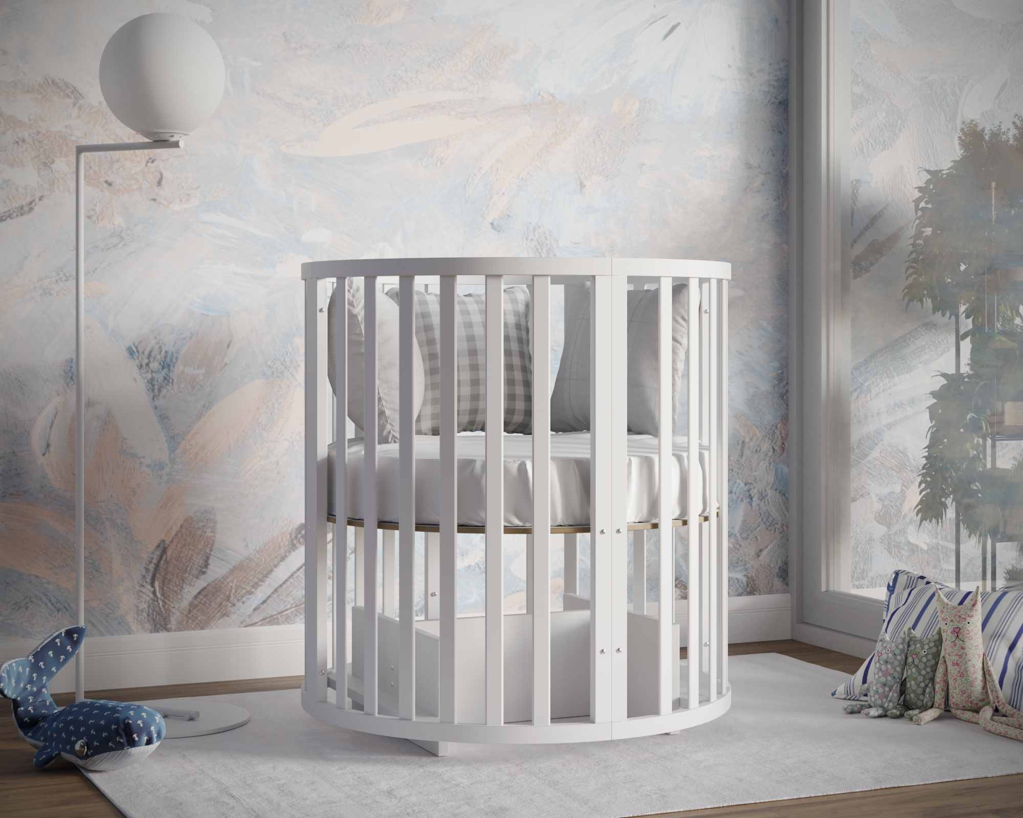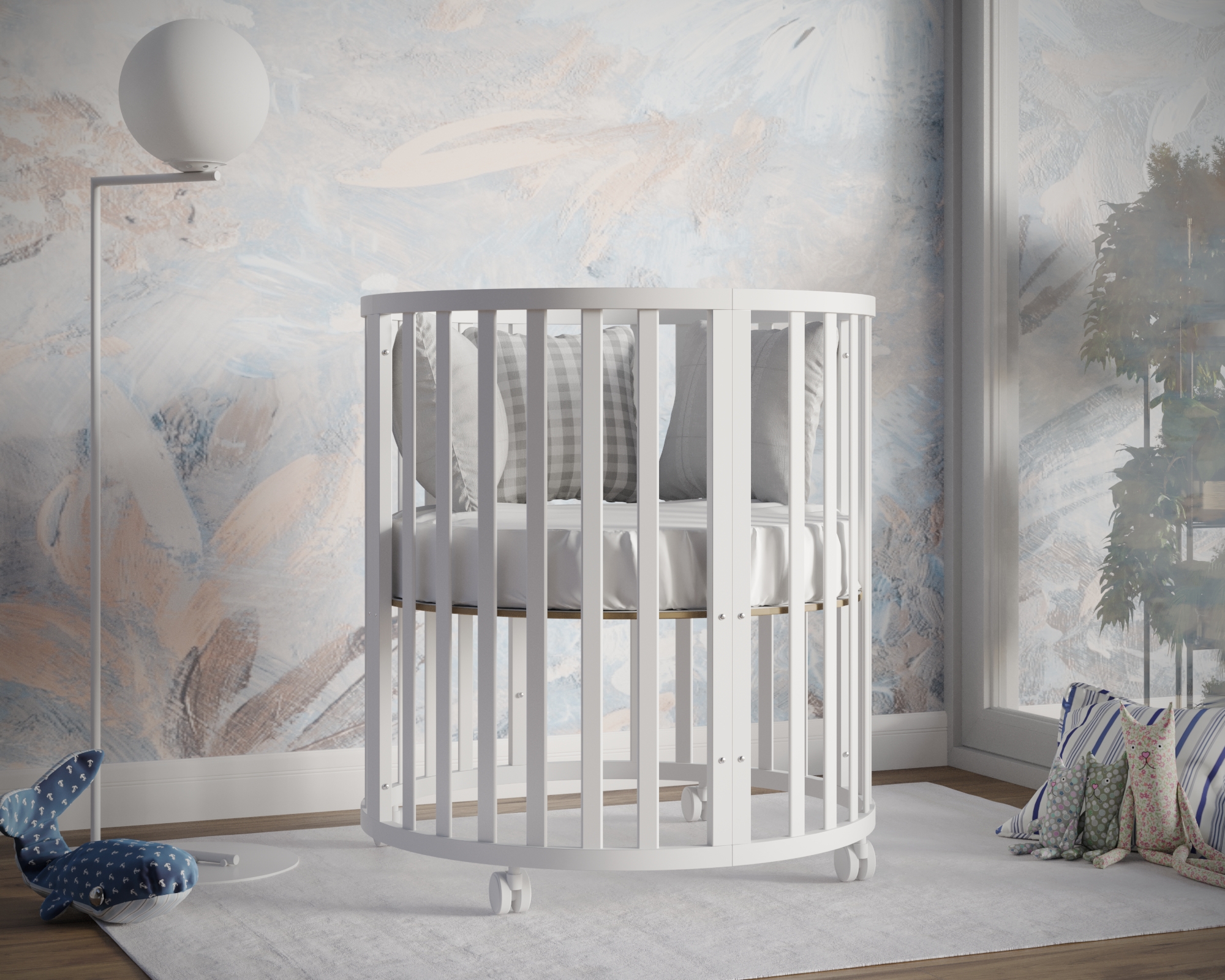 Круглая кроватка Tesoro Aurora Maxi 10 в 1 — новая модель, сочетающая доступную цену и высокое качество. Она изготовлена из массива натуральной березы с применением европейской фурнитуры и современных итальянских лакокрасочных материалов. В комплекте предусмотрены съемная передняя стенка, колеса со стопорами, поперечный маятник и 10 вариантов трансформации. Дополнительно можно приобрести прозрачные накладки-грызунки.