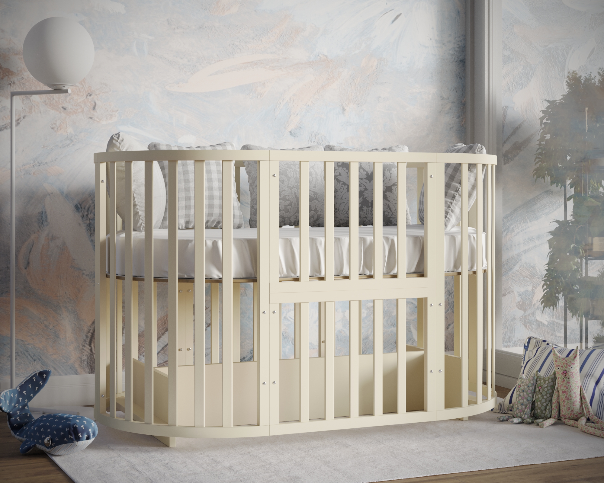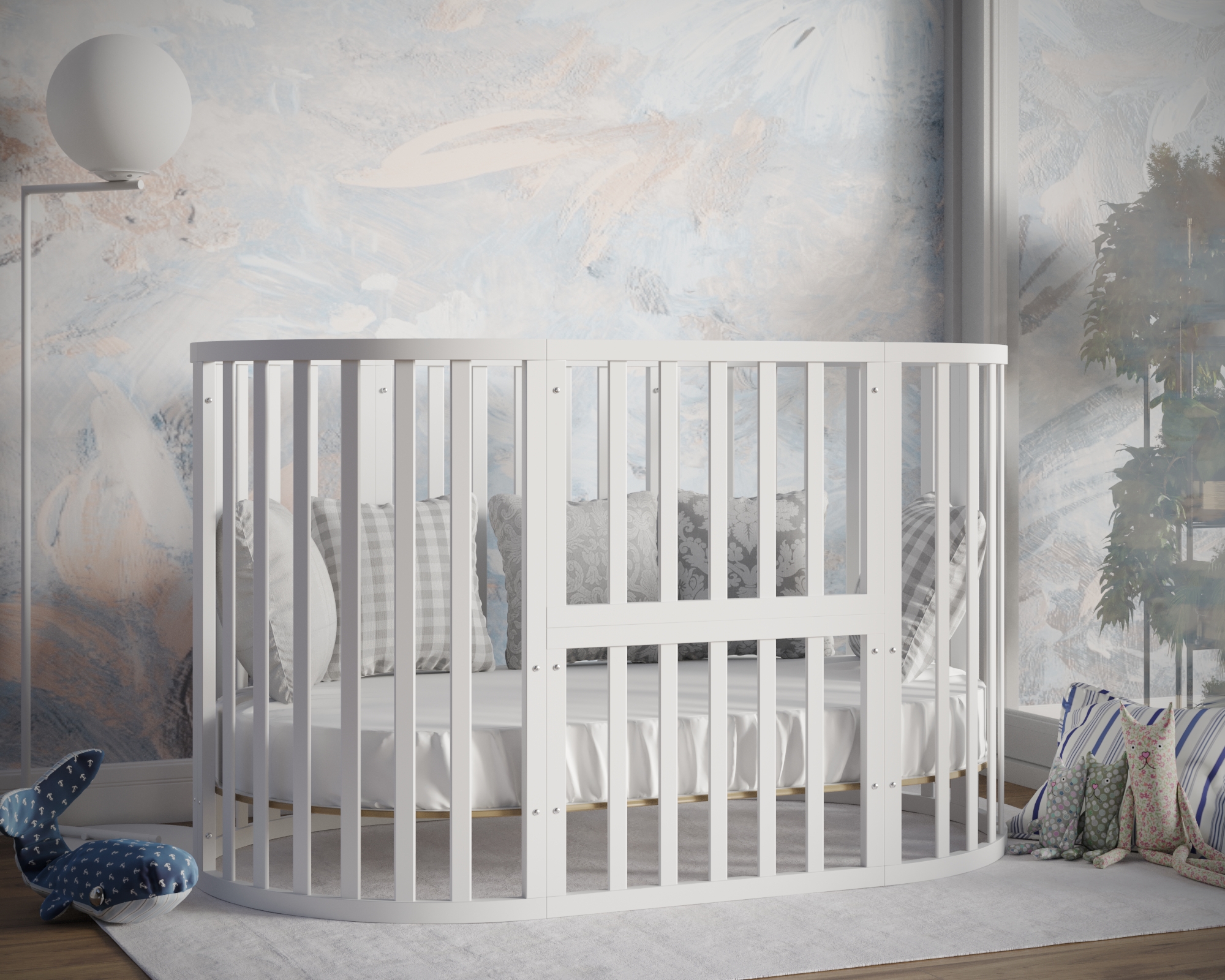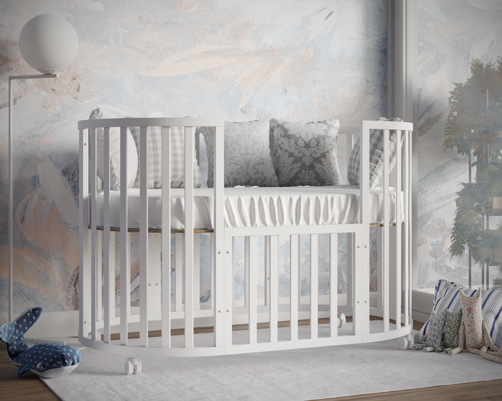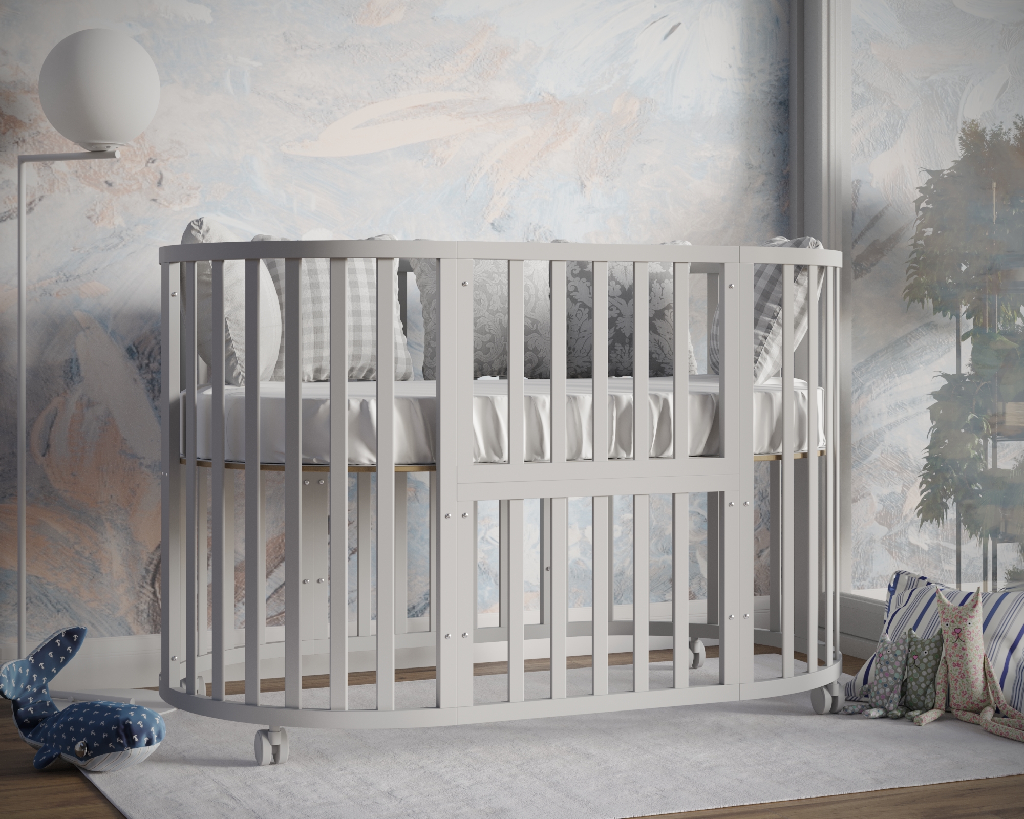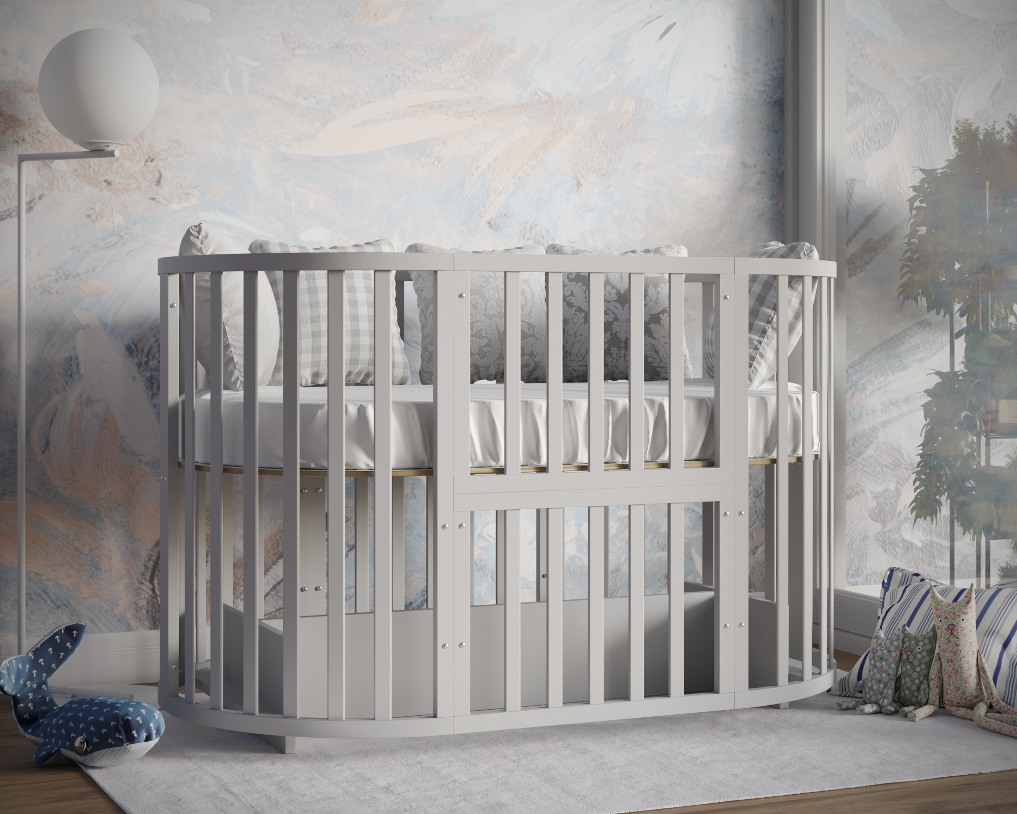 Круглая кроватка Tesoro Aurora Maxi 10 в 1 — новая модель, сочетающая доступную цену и высокое качество. Она изготовлена из массива натуральной березы с применением европейской фурнитуры и современных итальянских лакокрасочных материалов. В комплекте предусмотрены съемная передняя стенка, колеса со стопорами, поперечный маятник и 10 вариантов трансформации. Дополнительно можно приобрести прозрачные накладки-грызунки.