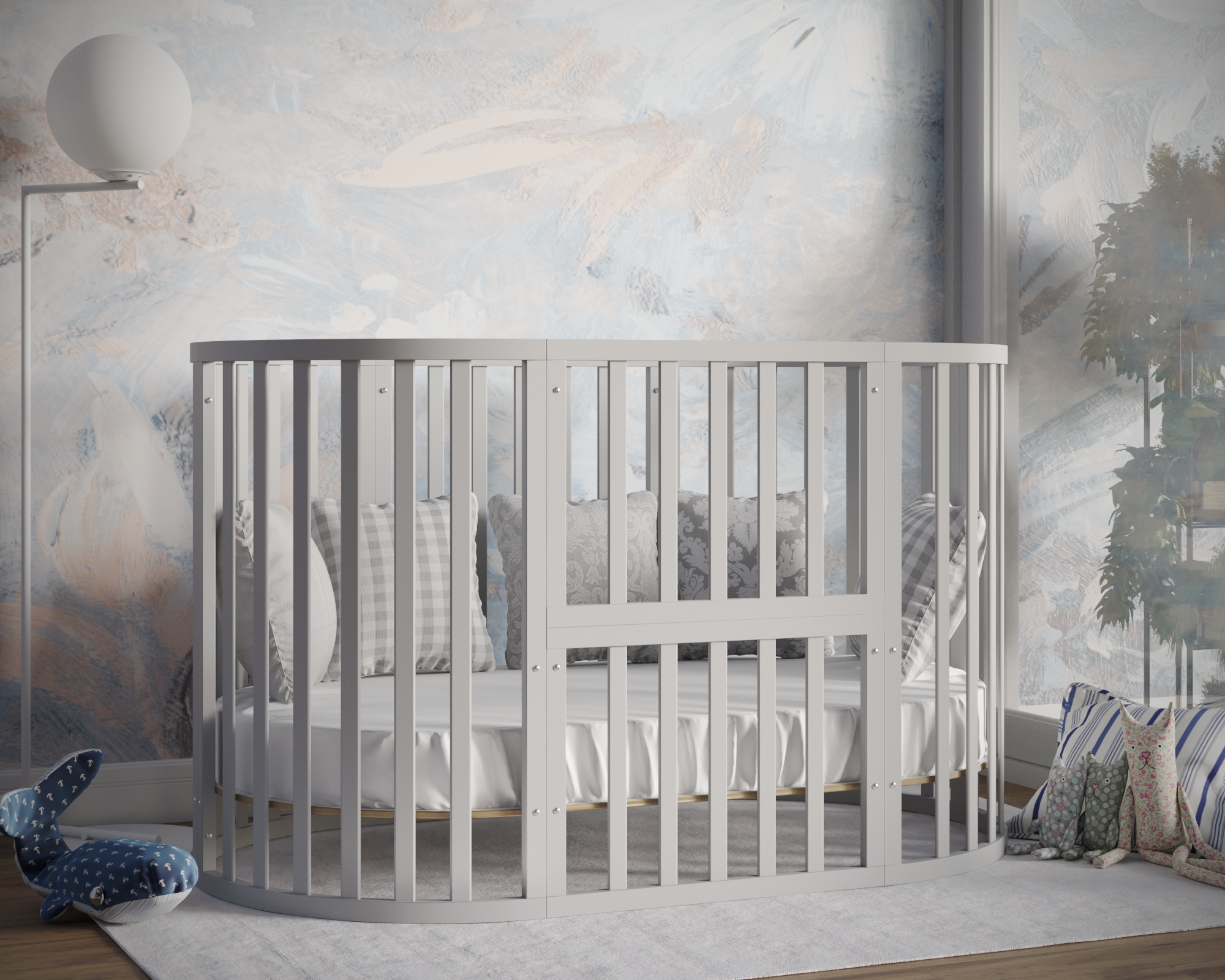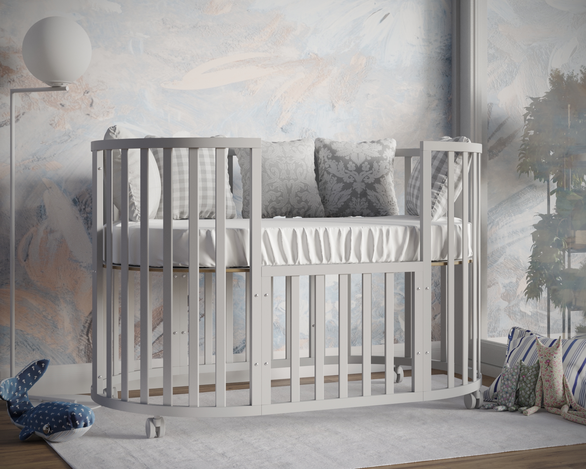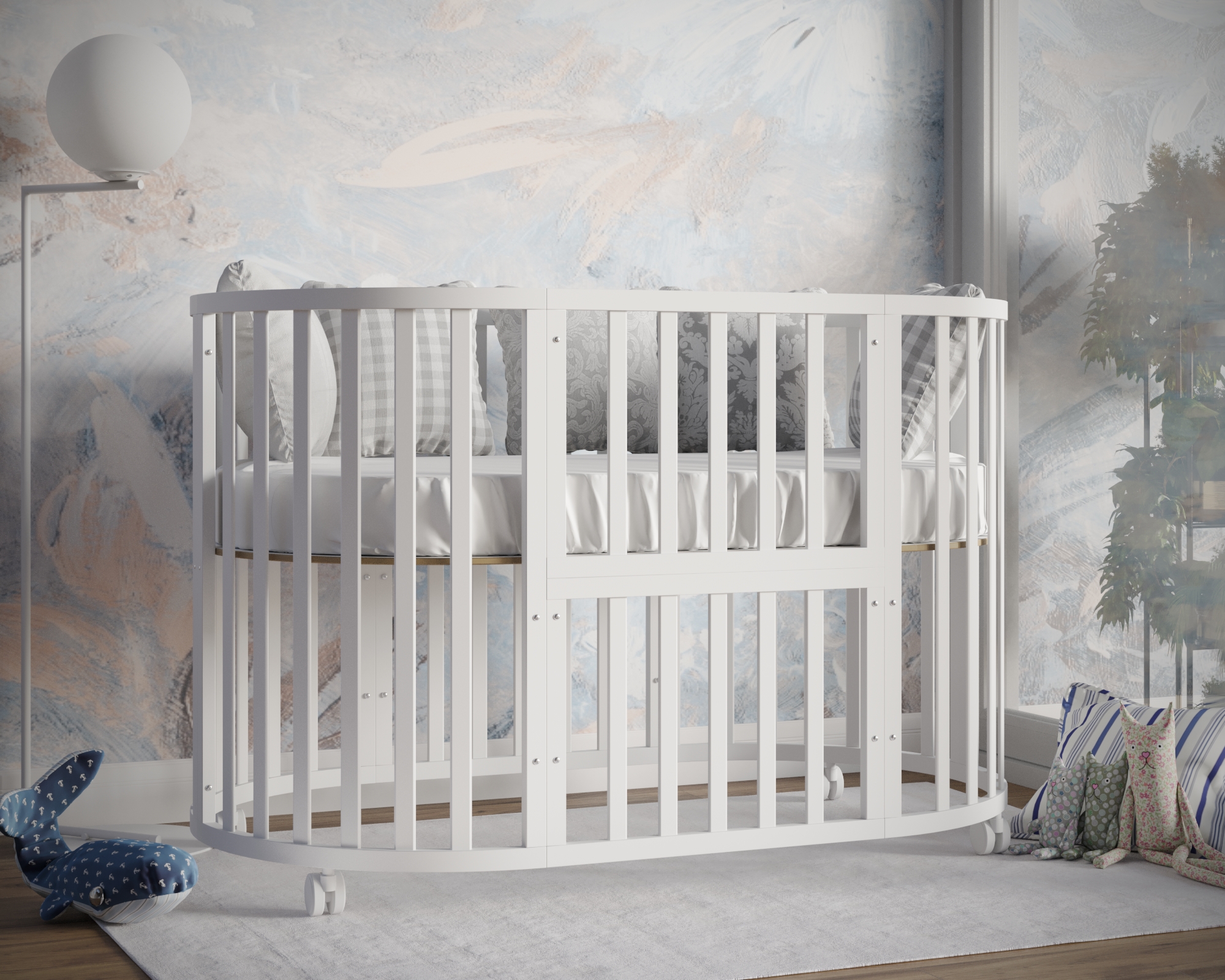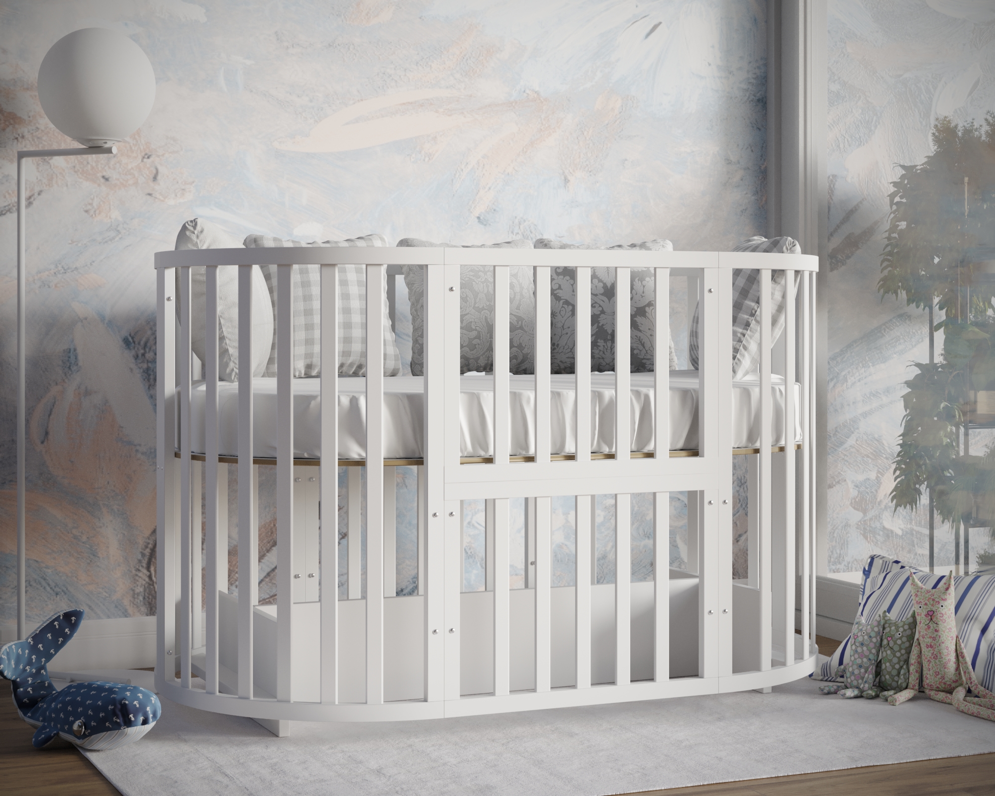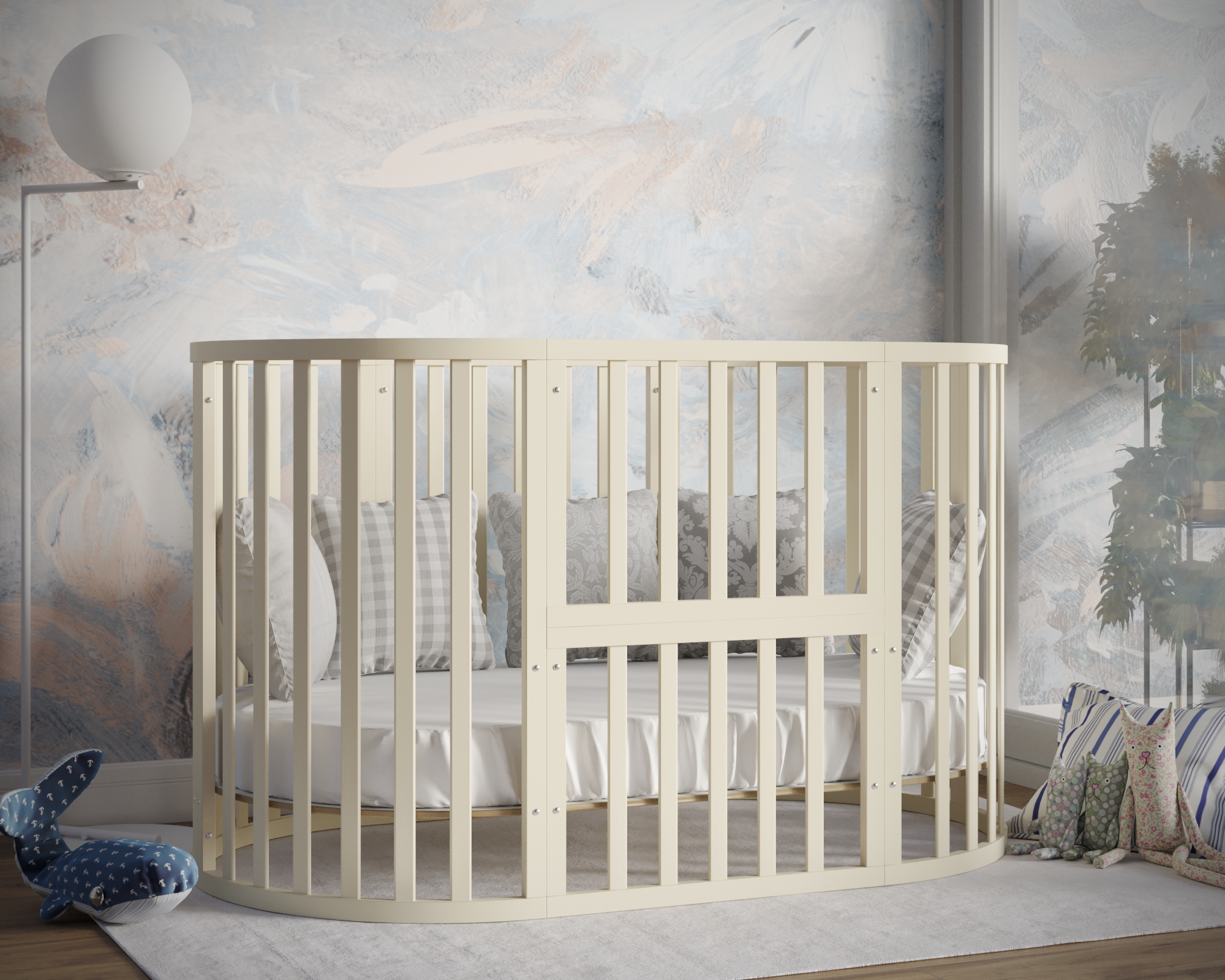 Овальная кроватка (125×75 см) — удобна для сна ребенка до 4–5 лет.