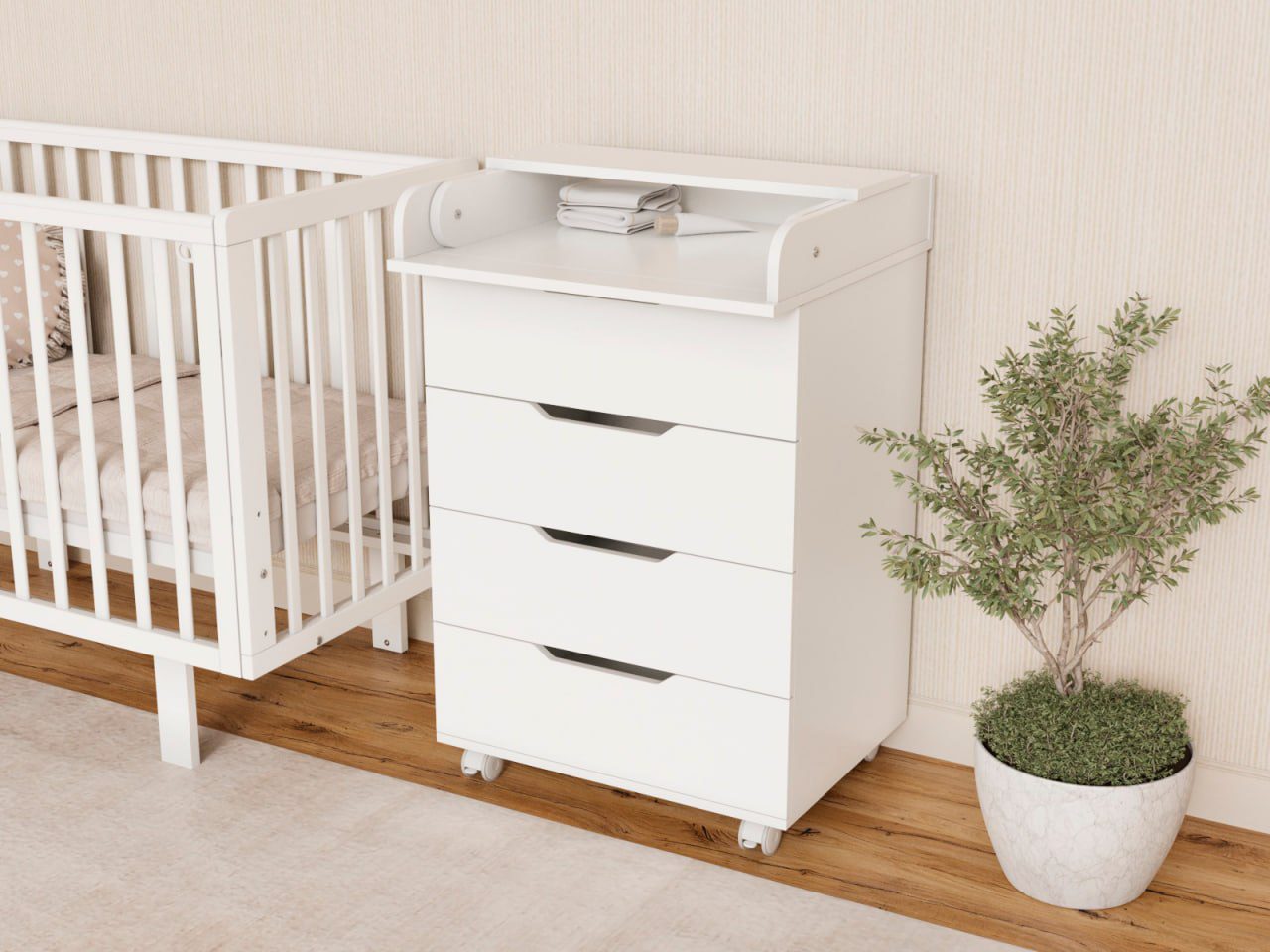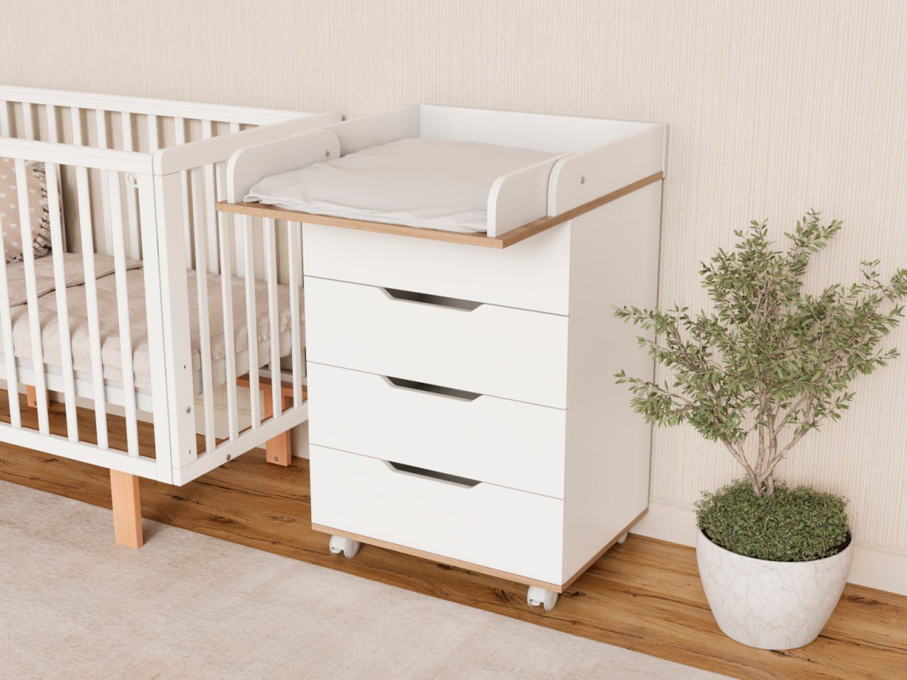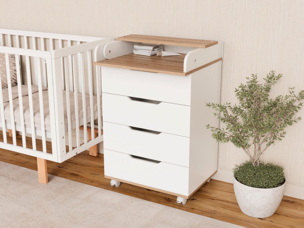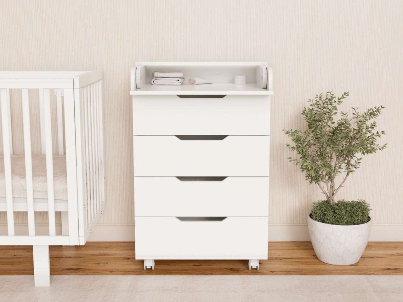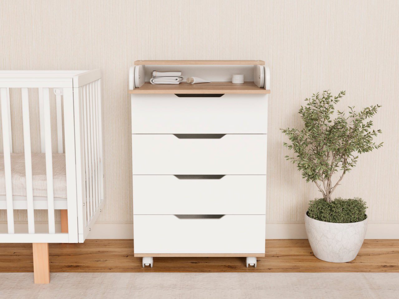 Пеленальный комод Tesoro Evo 600/4 — узкий, компактный и функциональный комод с пеленальным столиком, который удобно разместить даже в небольшой детской комнате.