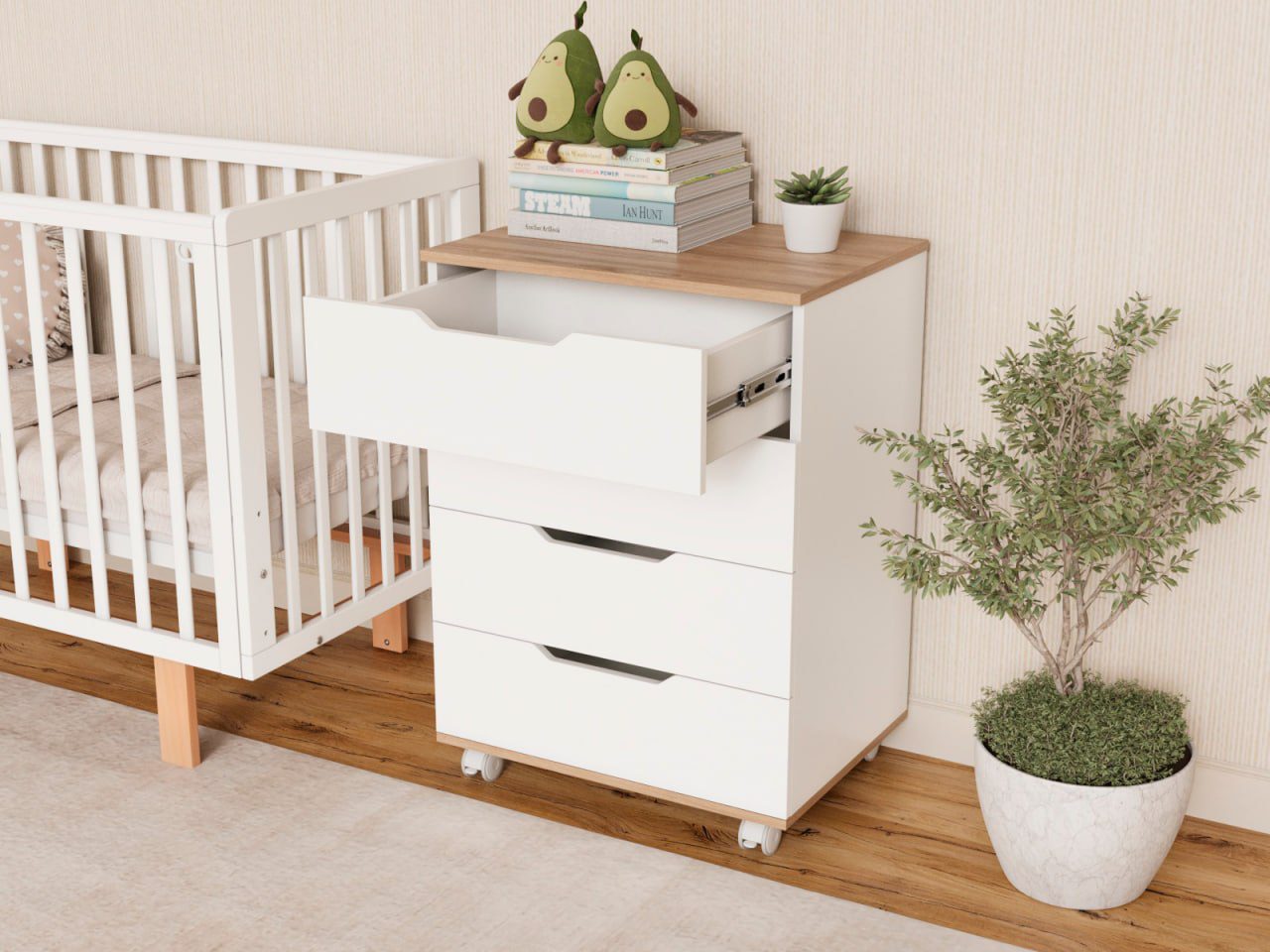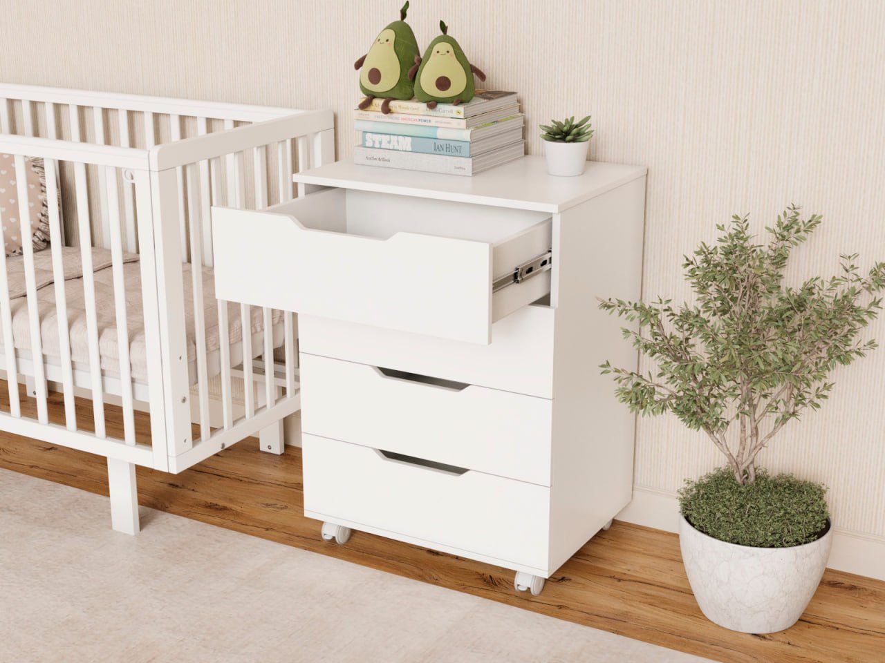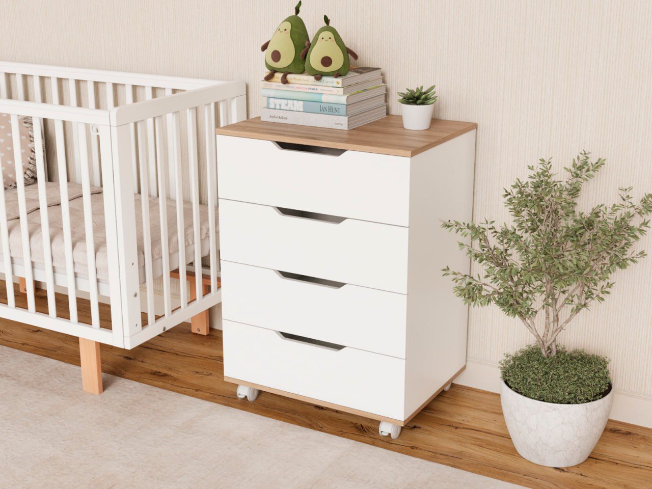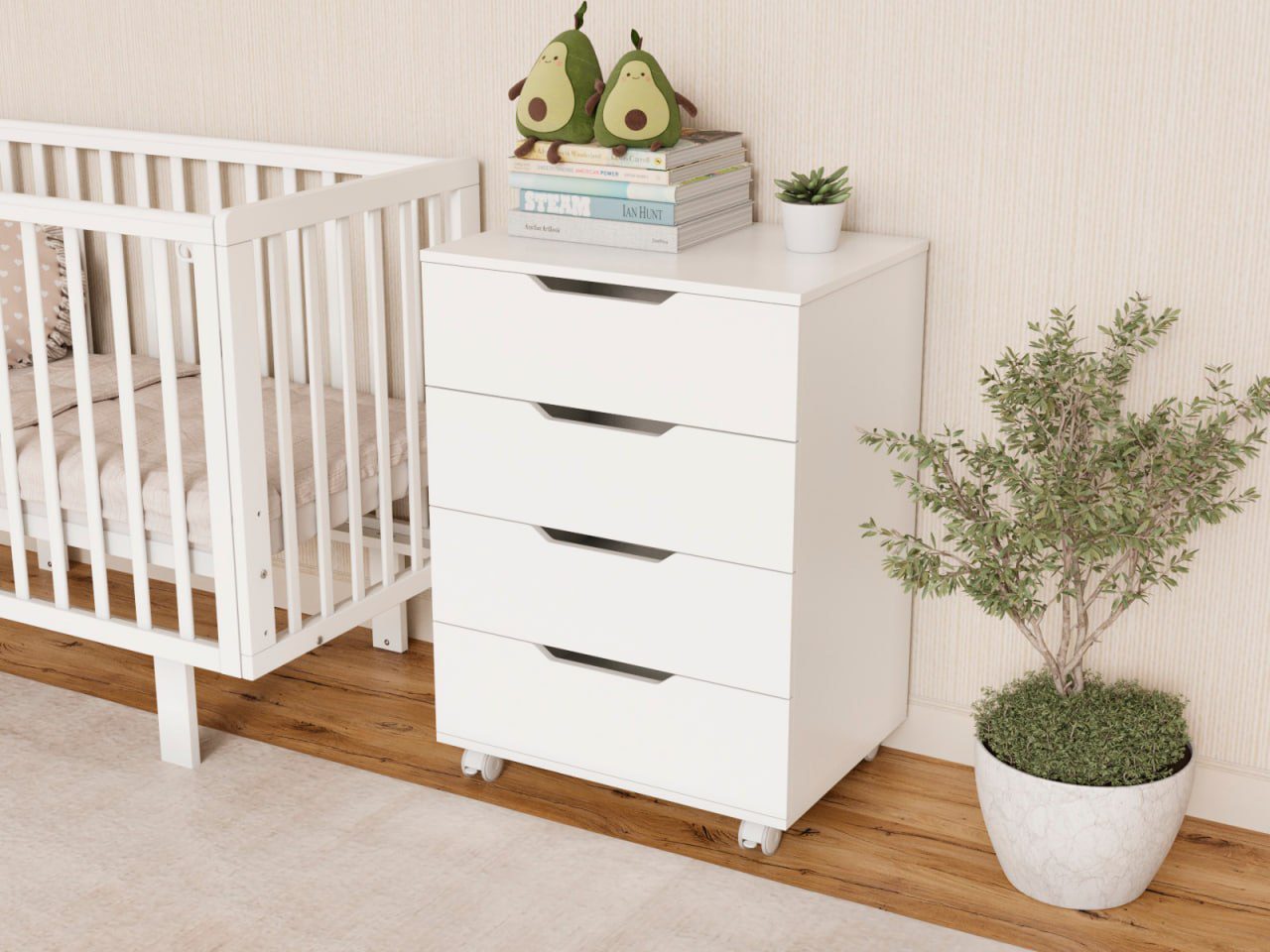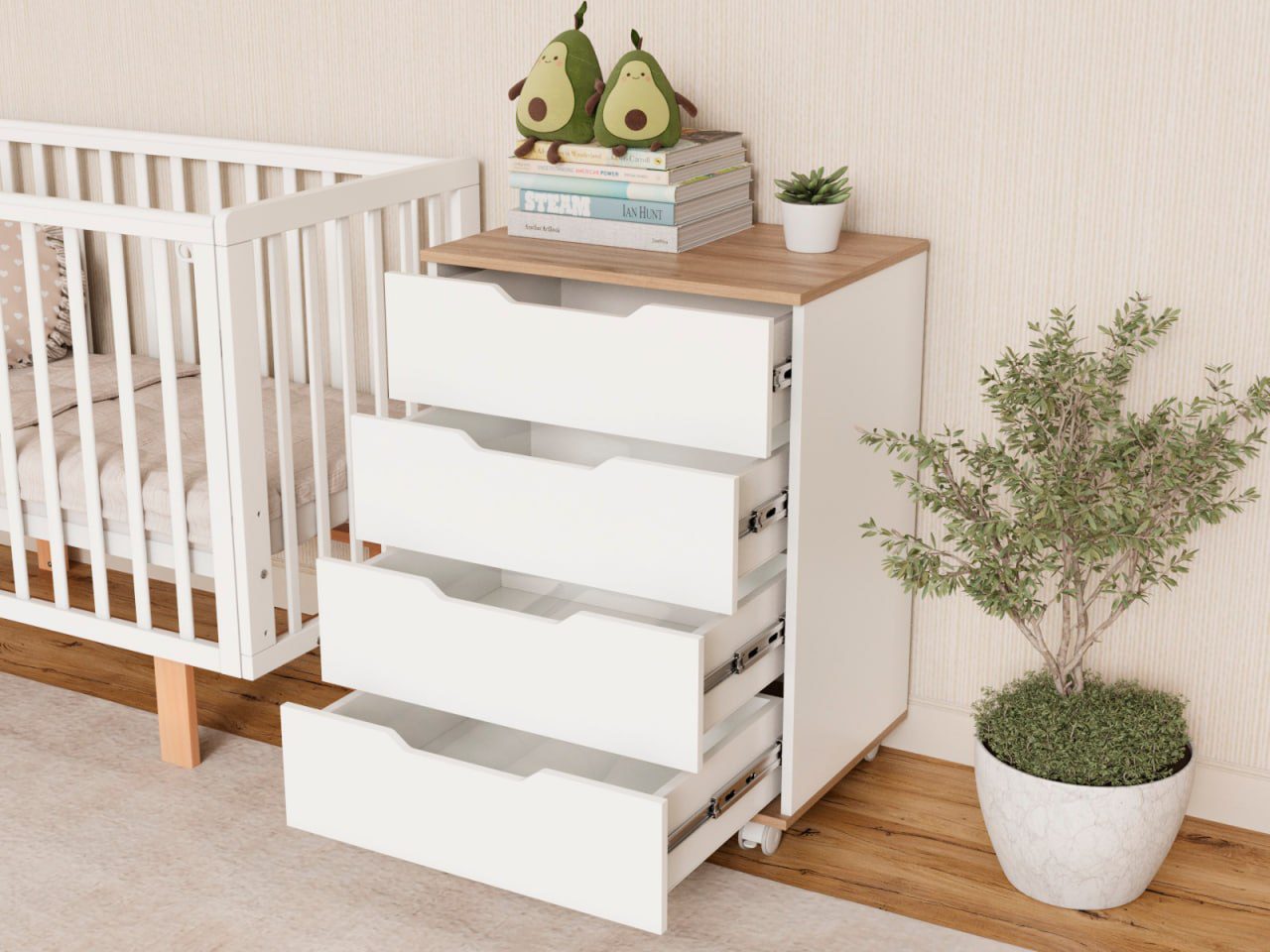 Комод оснащён четырьмя просторными ящиками (ширина 600 мм) для одежды, белья и аксессуаров малыша.