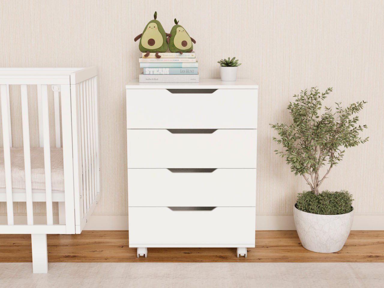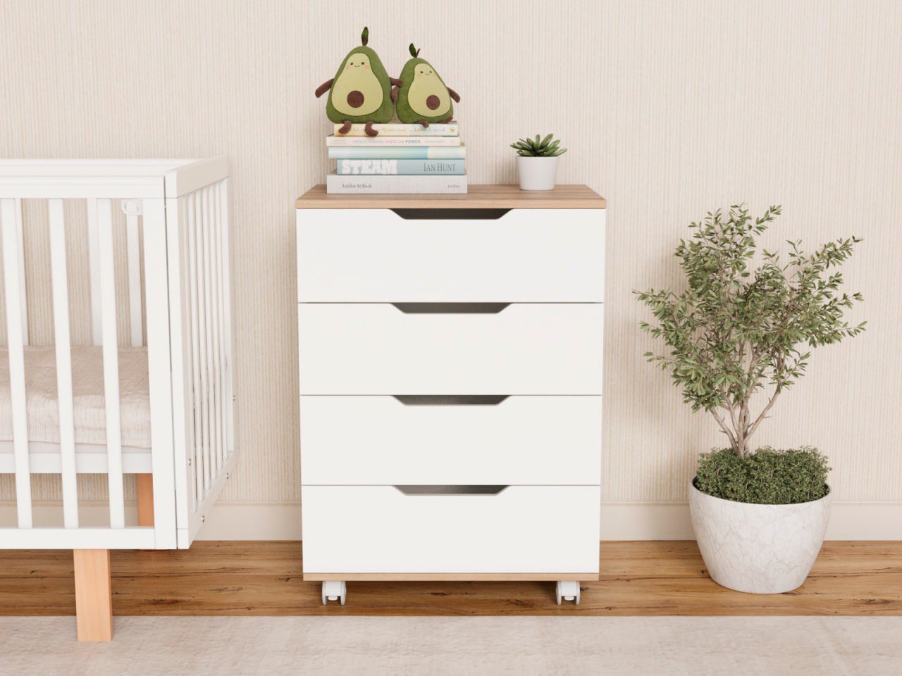 Мягкие резиновые колёса со стопором помогают легко перемещать комод по комнате и фиксировать его на месте.