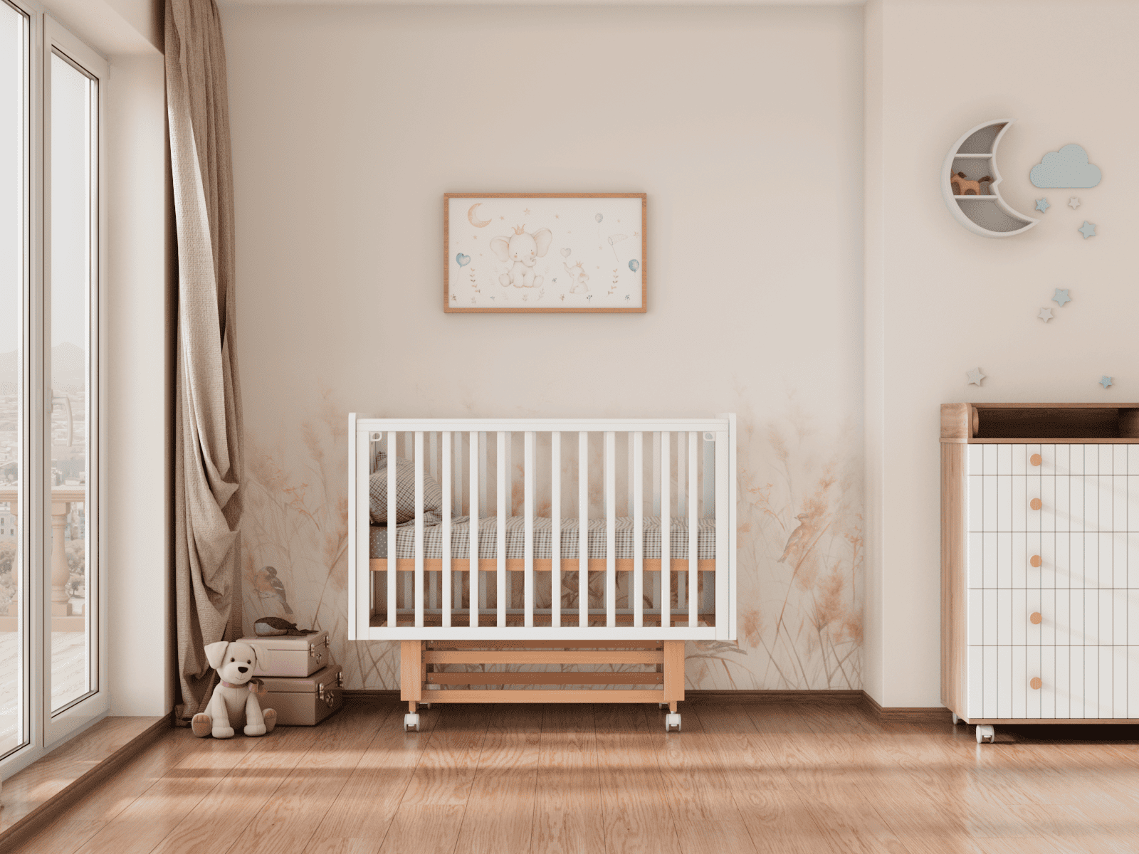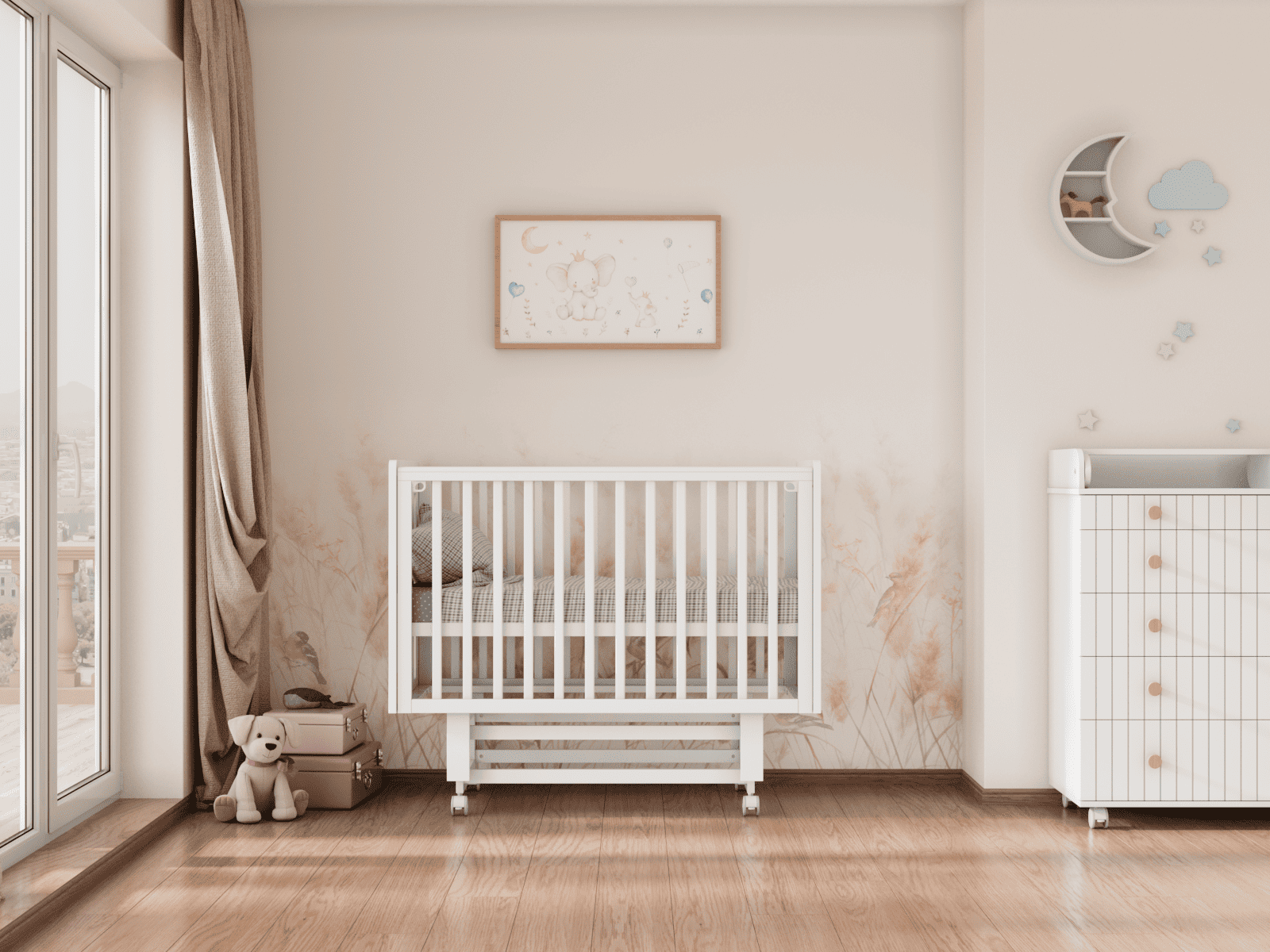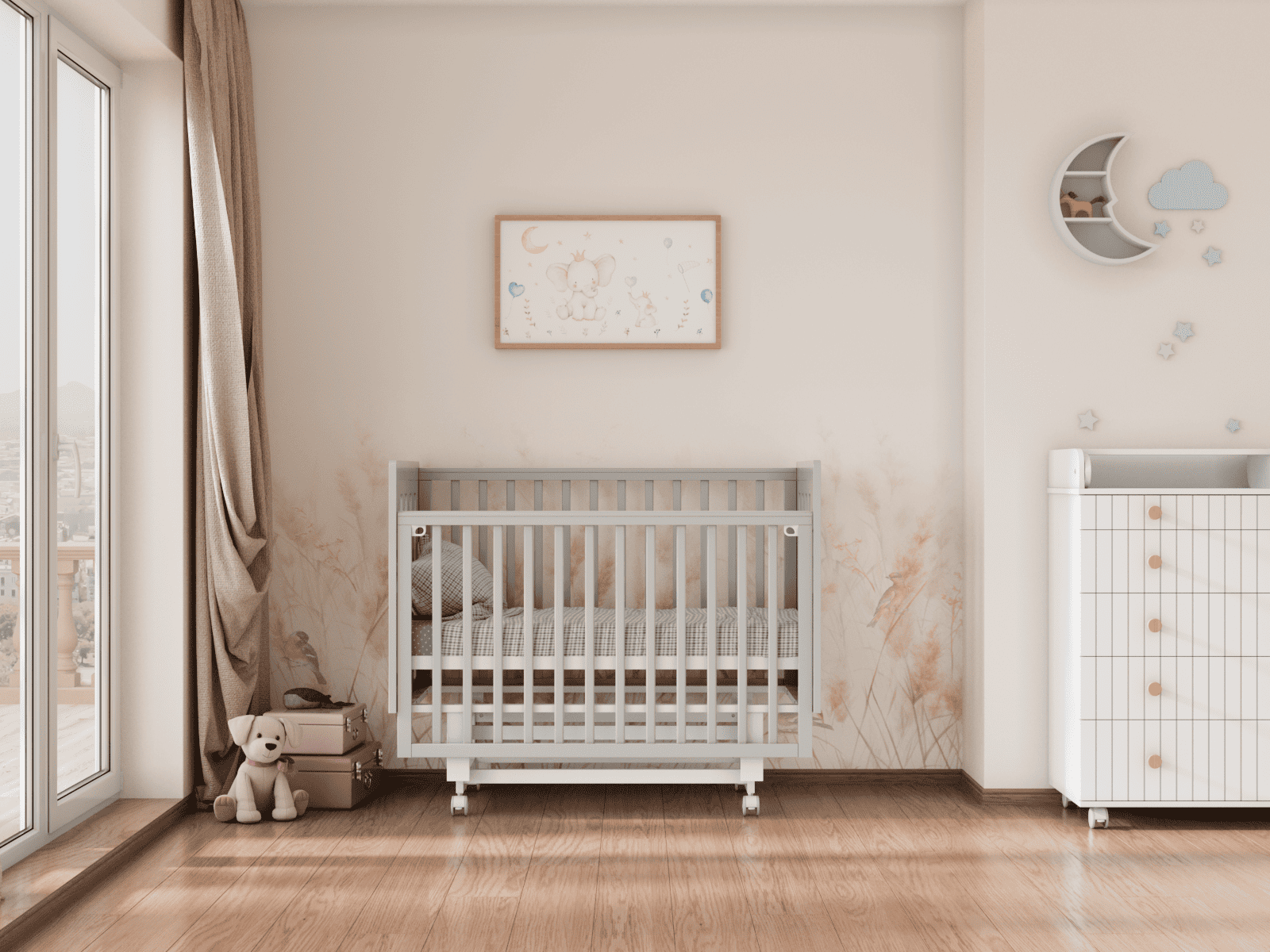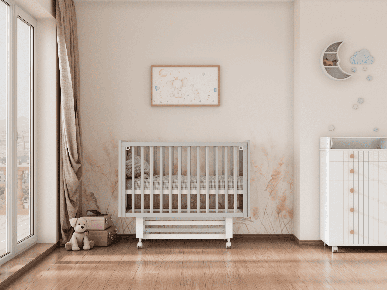 4 уровня регулировки высоты ложа — комфортно на разных этапах роста ребёнка и удобно для подстройки под высоту родительской кровати.