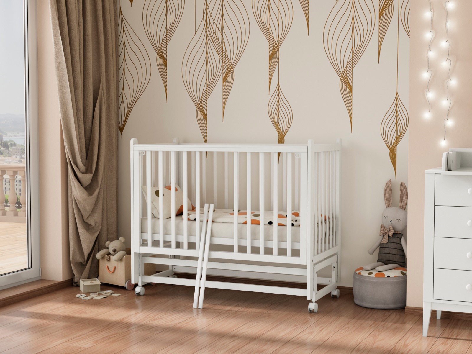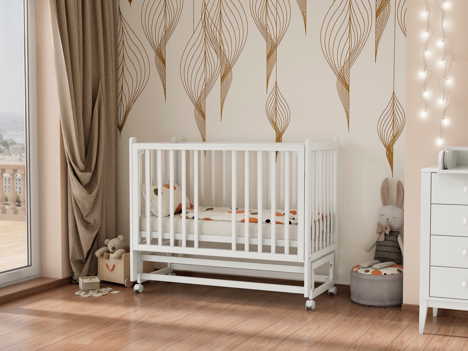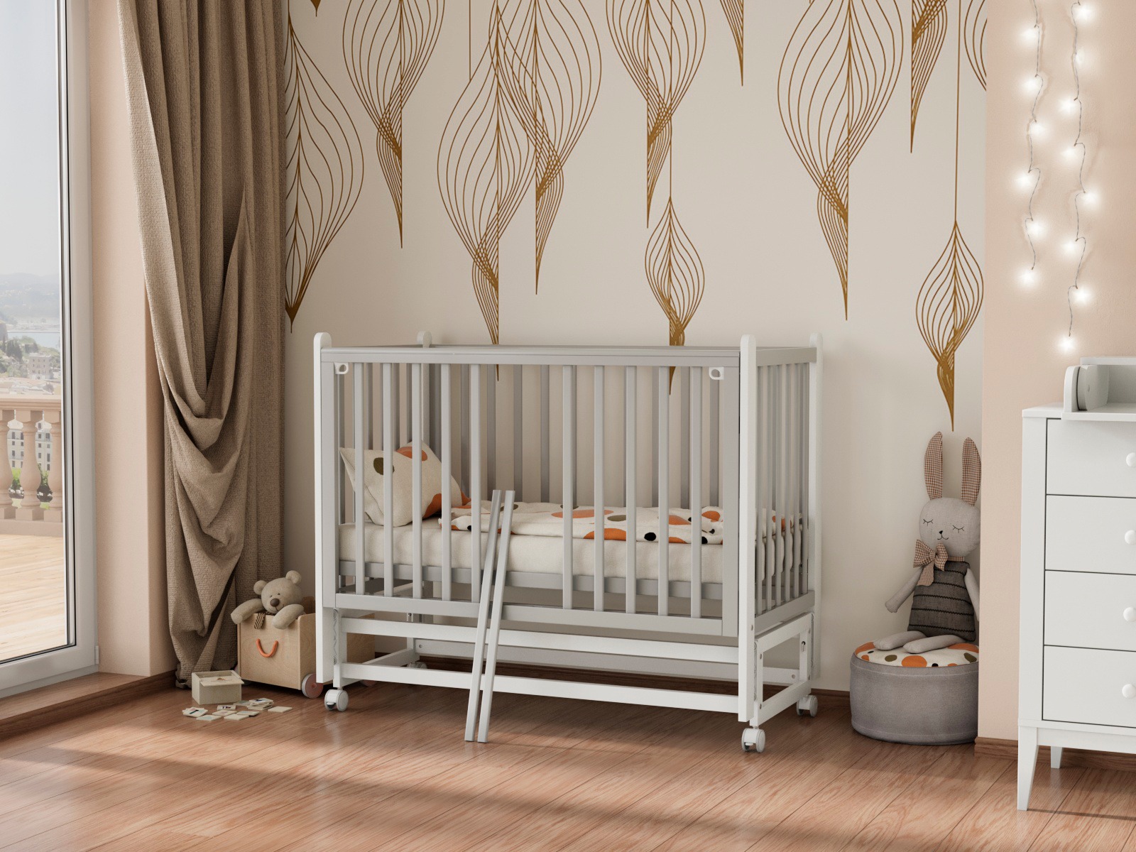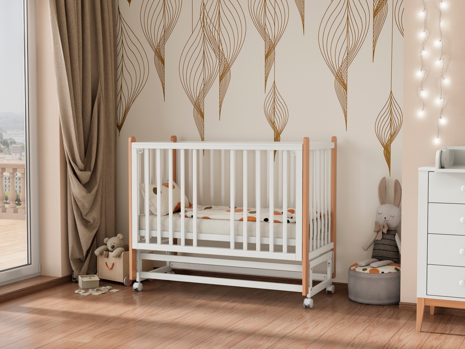 Детская кроватка Tesoro Mara — современная модель с легкосъёмной автостенкой, маятником на колесах и множеством уровней ложа.