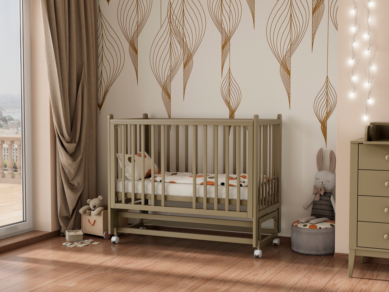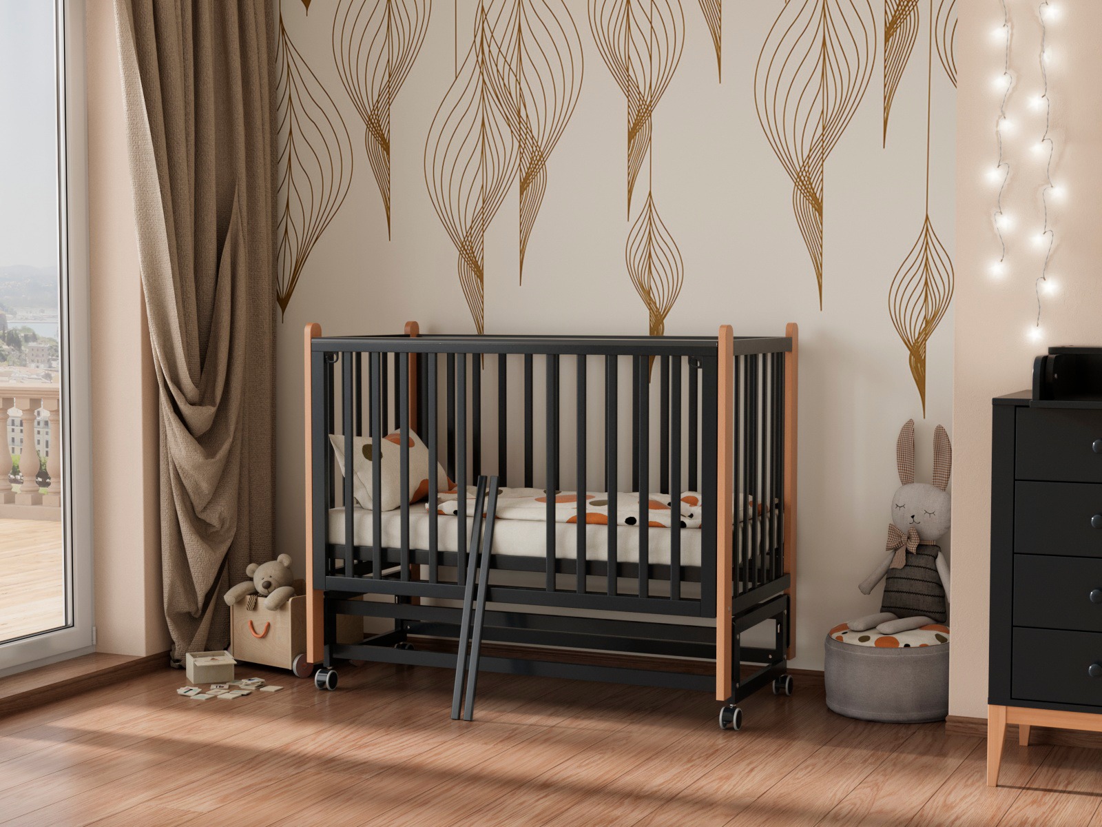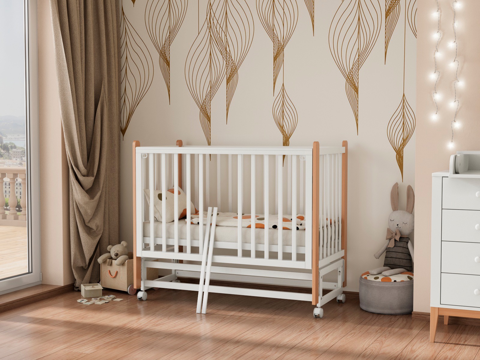 - Быстросъёмная боковая стенка «Автостенка» — легкое снятие или опускание облегчают использование как приставной кроватки.