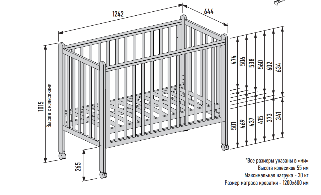 - 6 уровней регулировки высоты ложа (34, 37, 41, 43, 47, 50 см) — оптимально для разных этапов роста ребёнка, а также позволит подстроить высоту под вашу кровать.