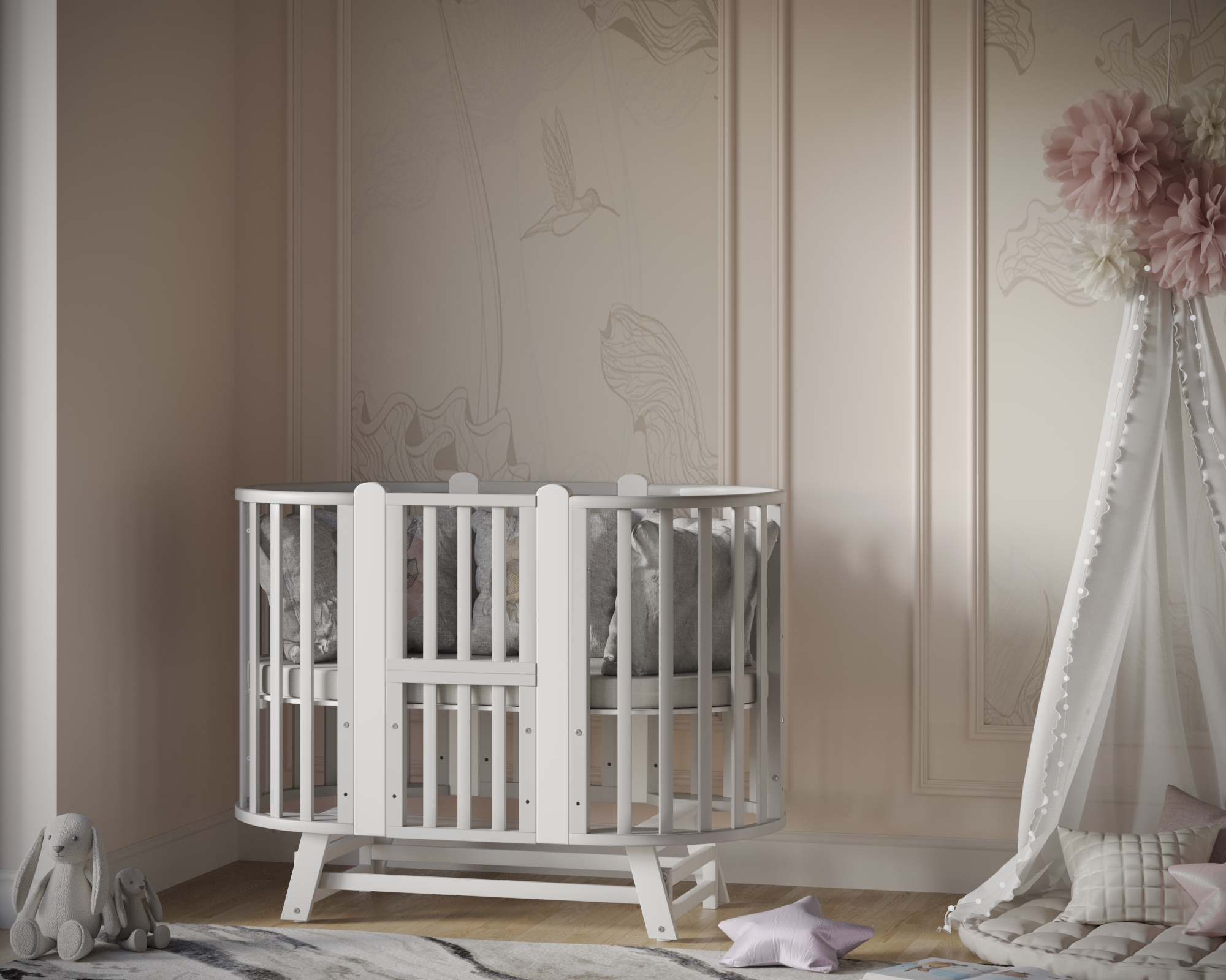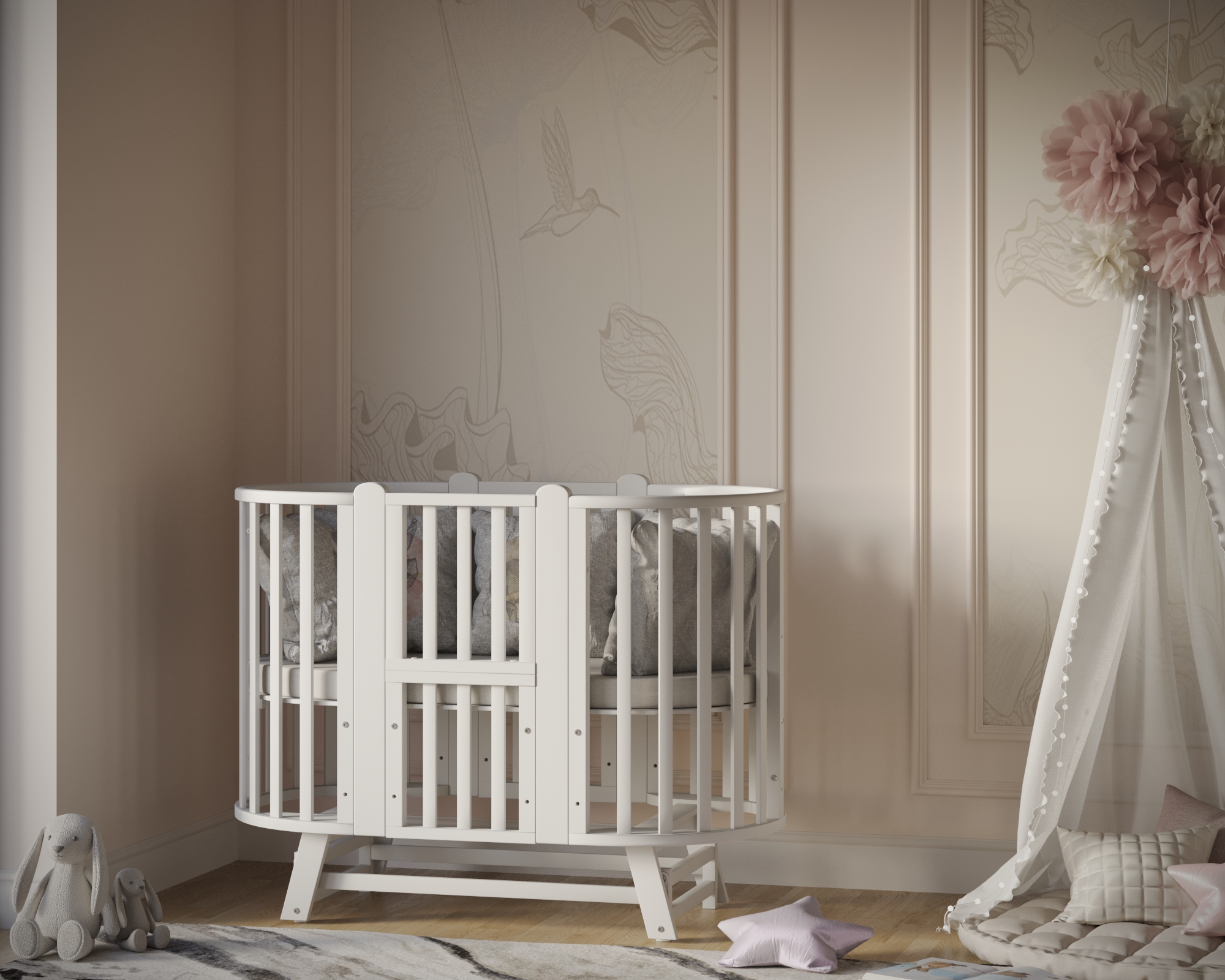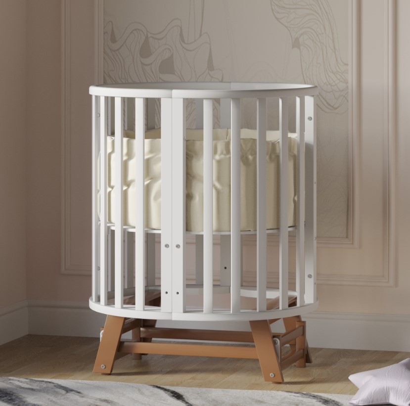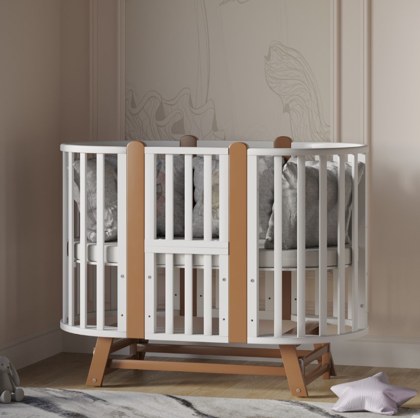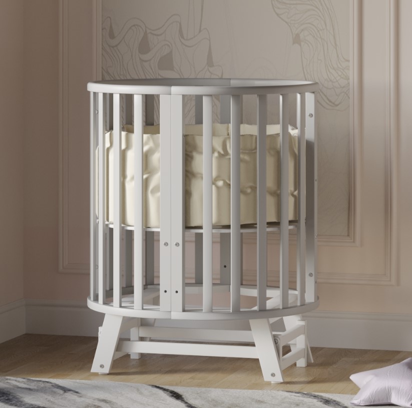 Универсальность: 9 вариантов трансформации — колыбелька, овальная кровать, манеж, приставная кроватка-диванчик, столик, стульчики и др.
