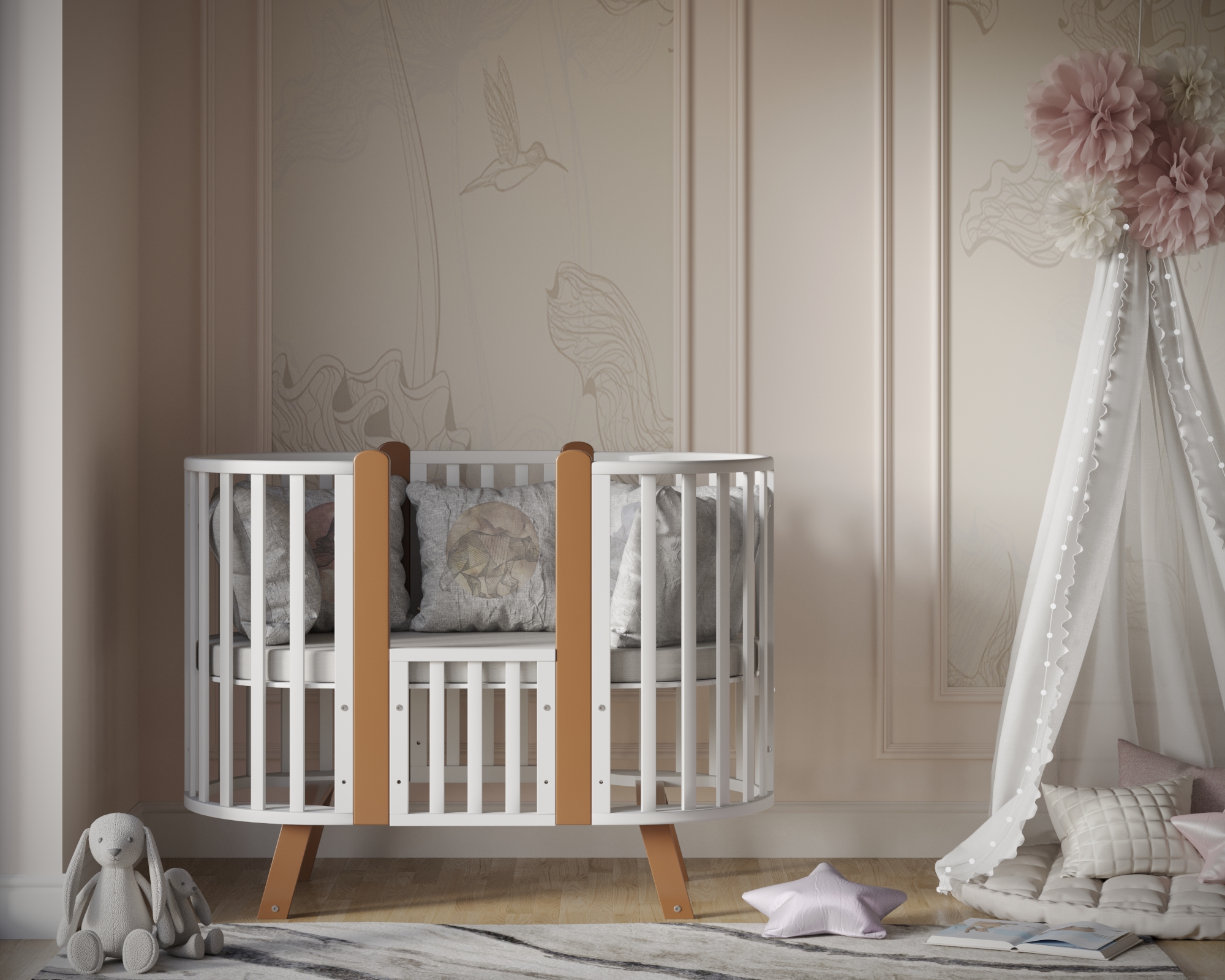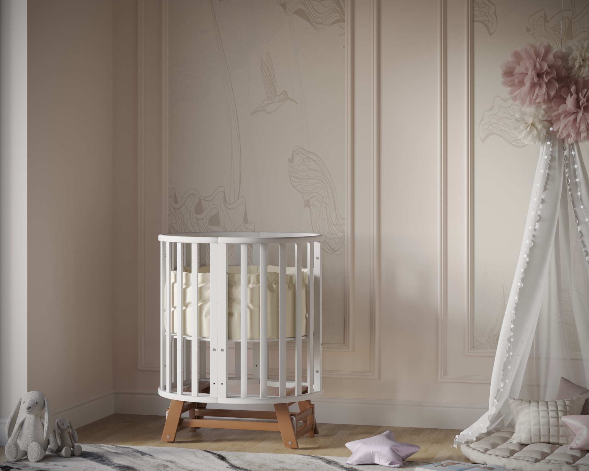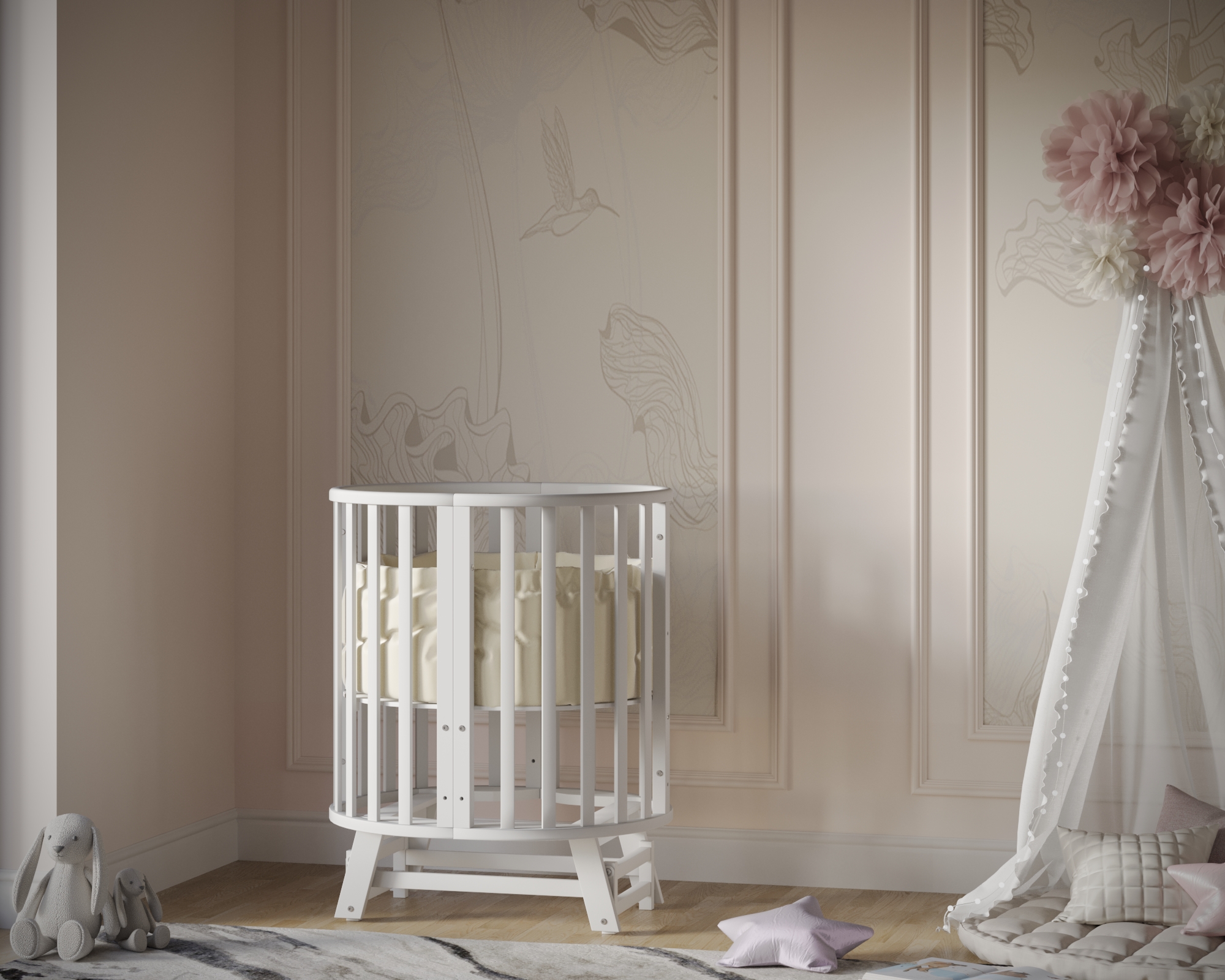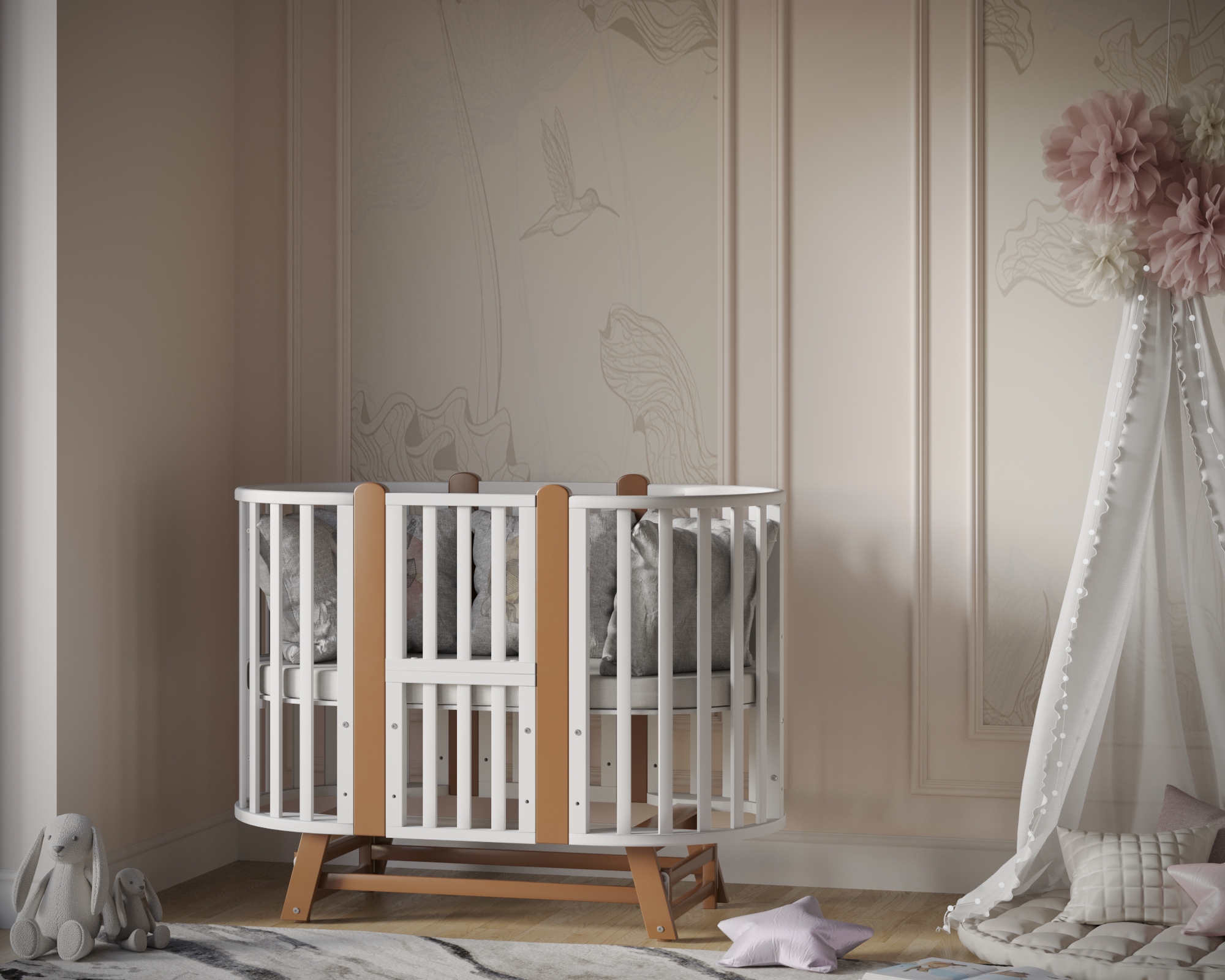 Универсальность: 9 вариантов трансформации — колыбелька, овальная кровать, манеж, приставная кроватка-диванчик, столик, стульчики и др.