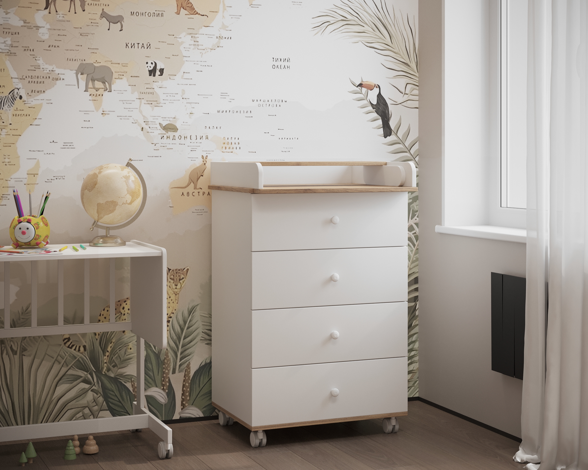 — В комплекте идут прорезиненные мягкие колеса при помощи которых можно бесшумно передвигать комод во время влажной уборки комнаты.