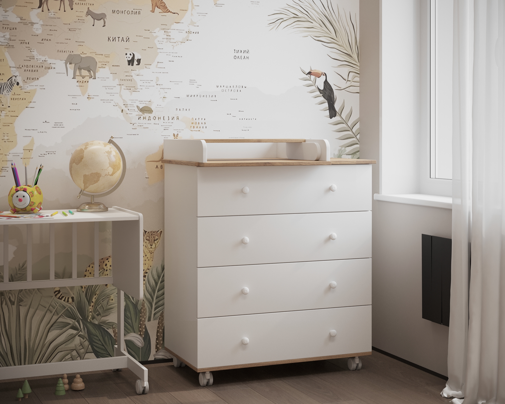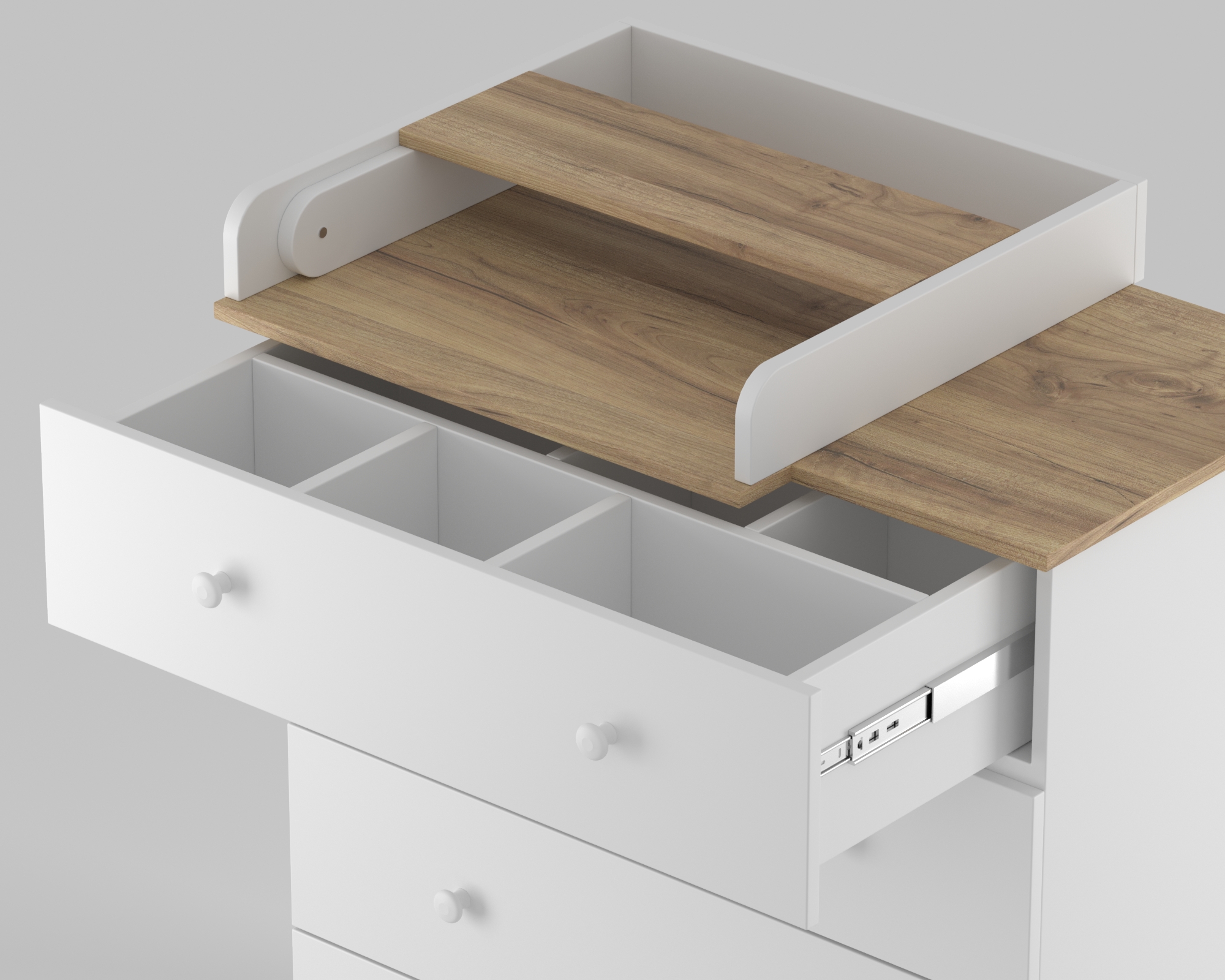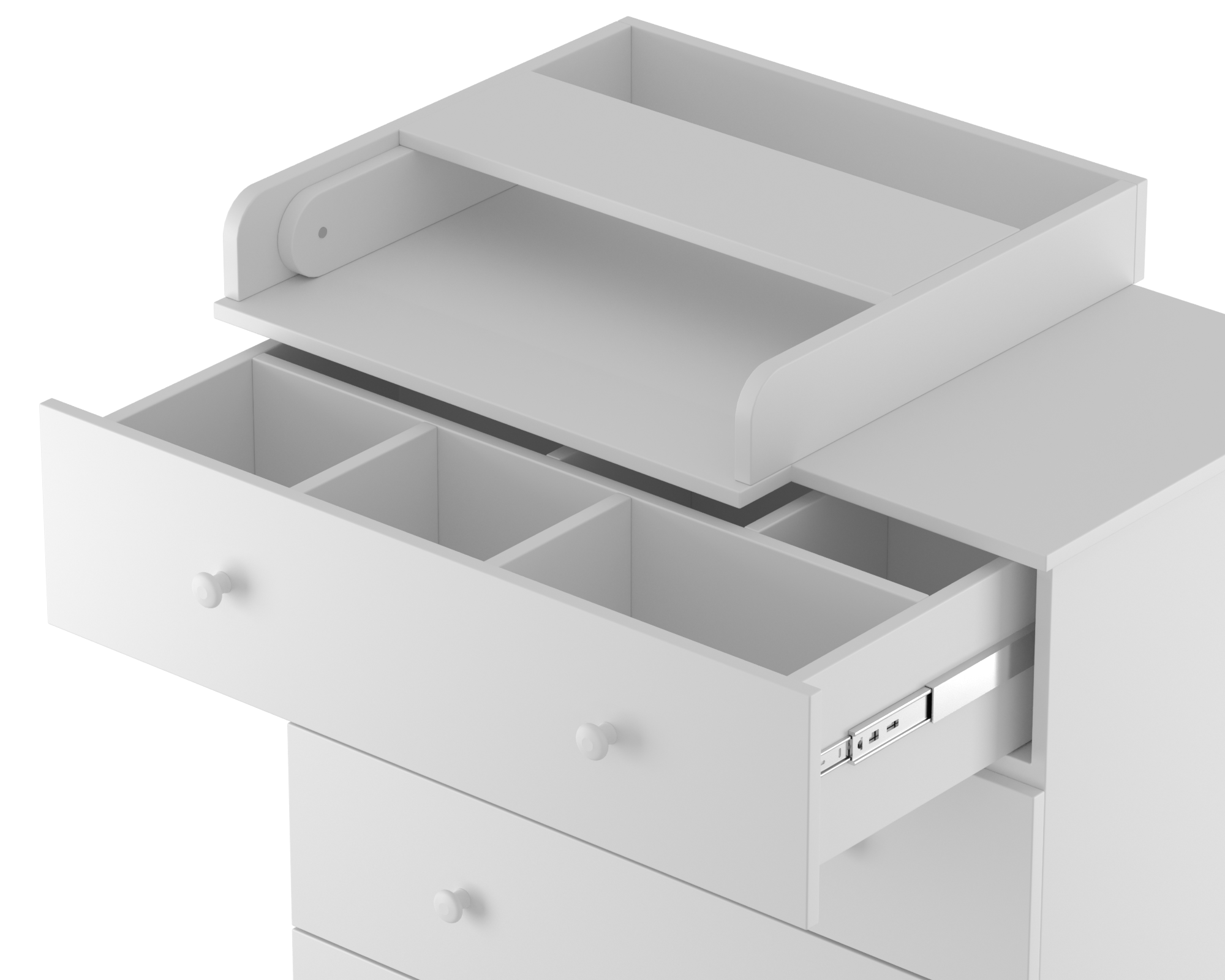 — Пеленальный столик с быстросъемной и раскладной конструкцией позволяет элементарно превратить комод в классический. Столик можно разместить слева, справа и по центру комода.