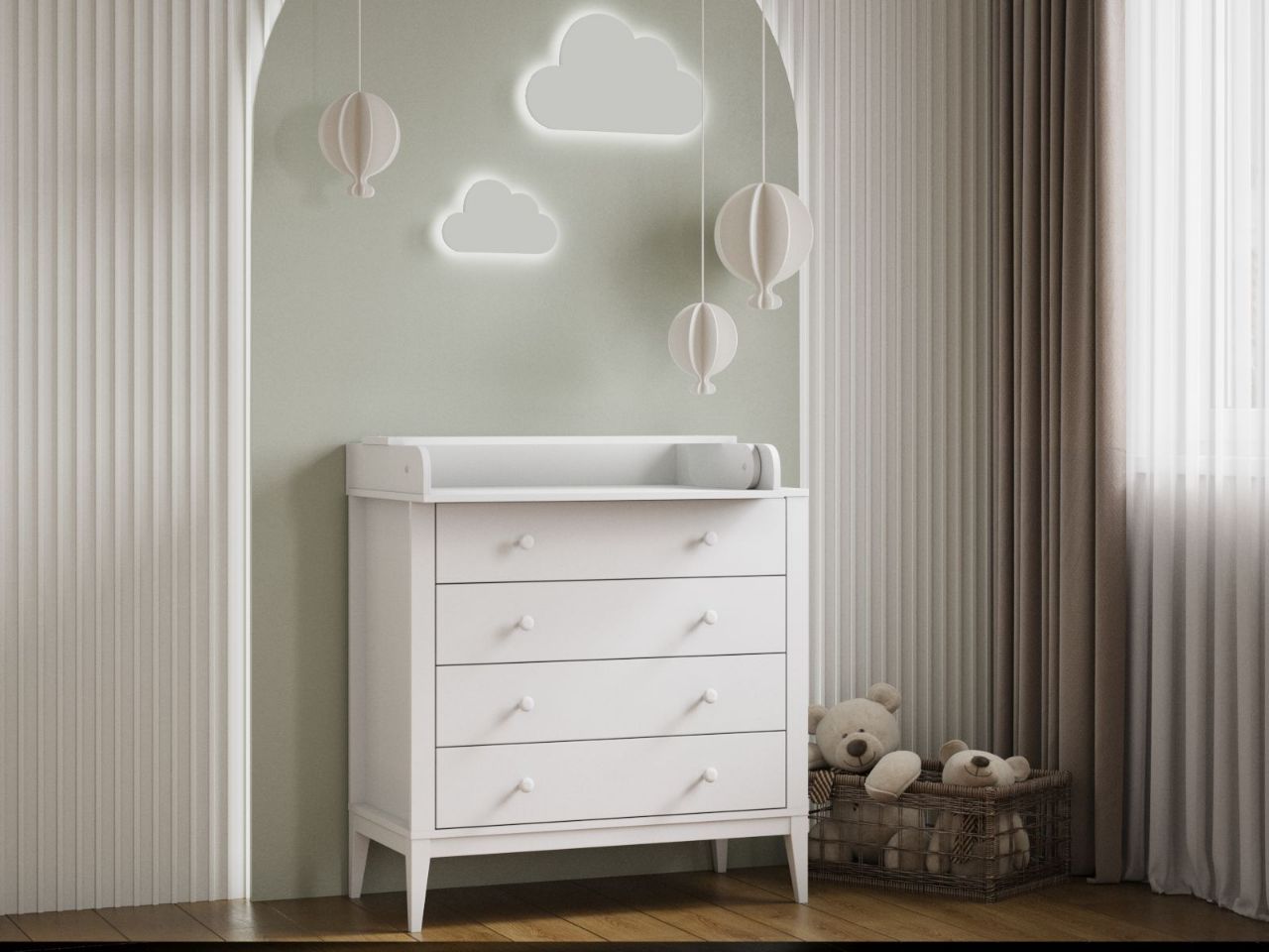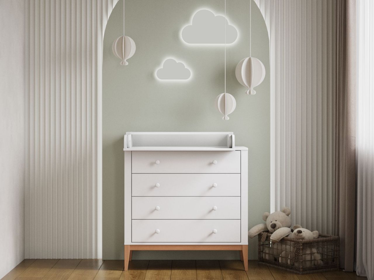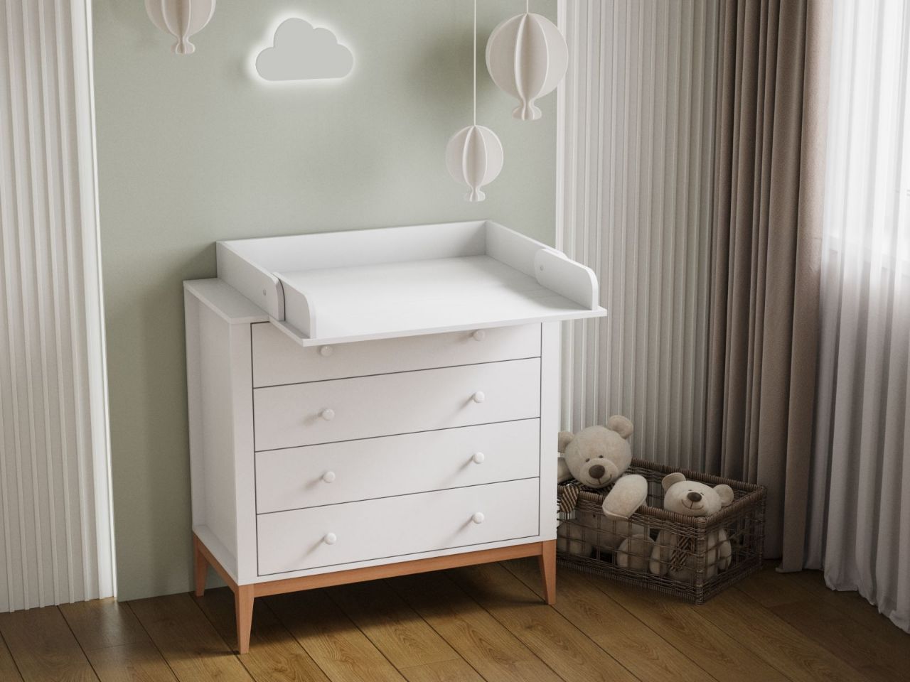 Конструкция продумана до мелочей: ножки из массива бука обеспечивают устойчивость, а ширина позволяет разместить удобную пеленальную доску. Съемный пеленальный столик с откидной крышкой экономит пространство.