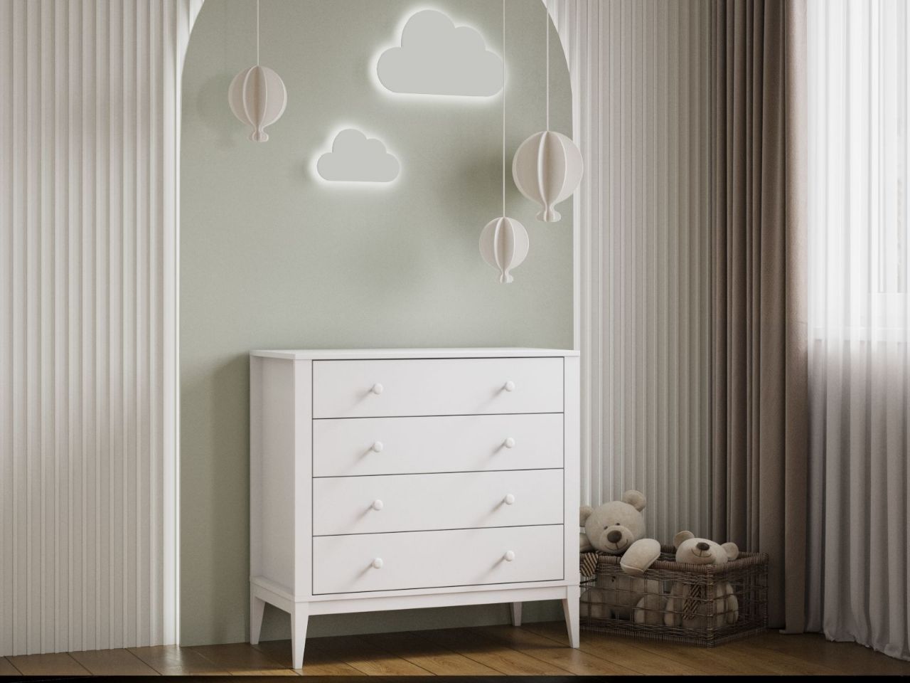 - Комод оснащен четырьмя просторными ящиками (ширина 900 мм), которые плавно и бесшумно выдвигаются благодаря шариковым направляющим.