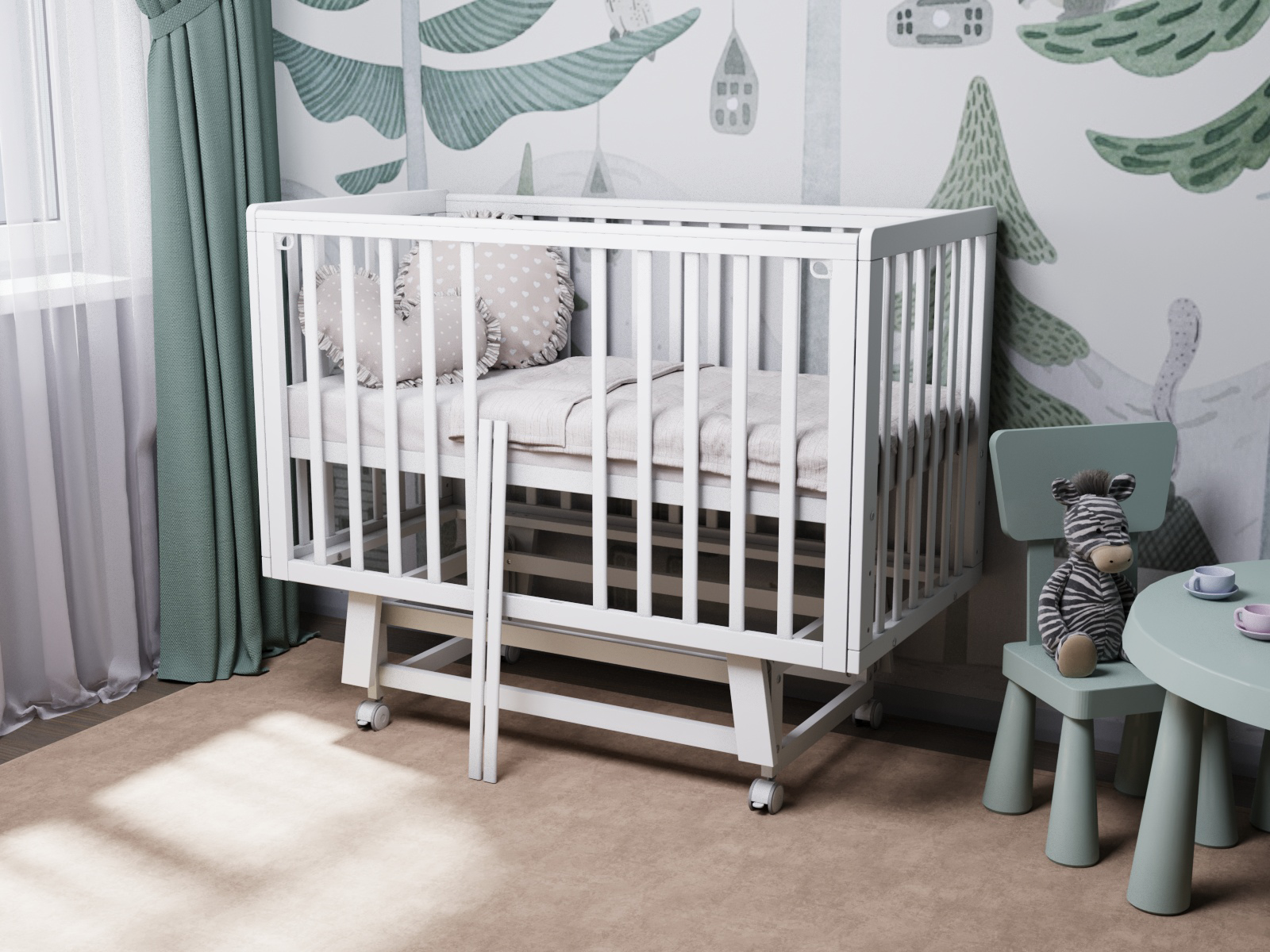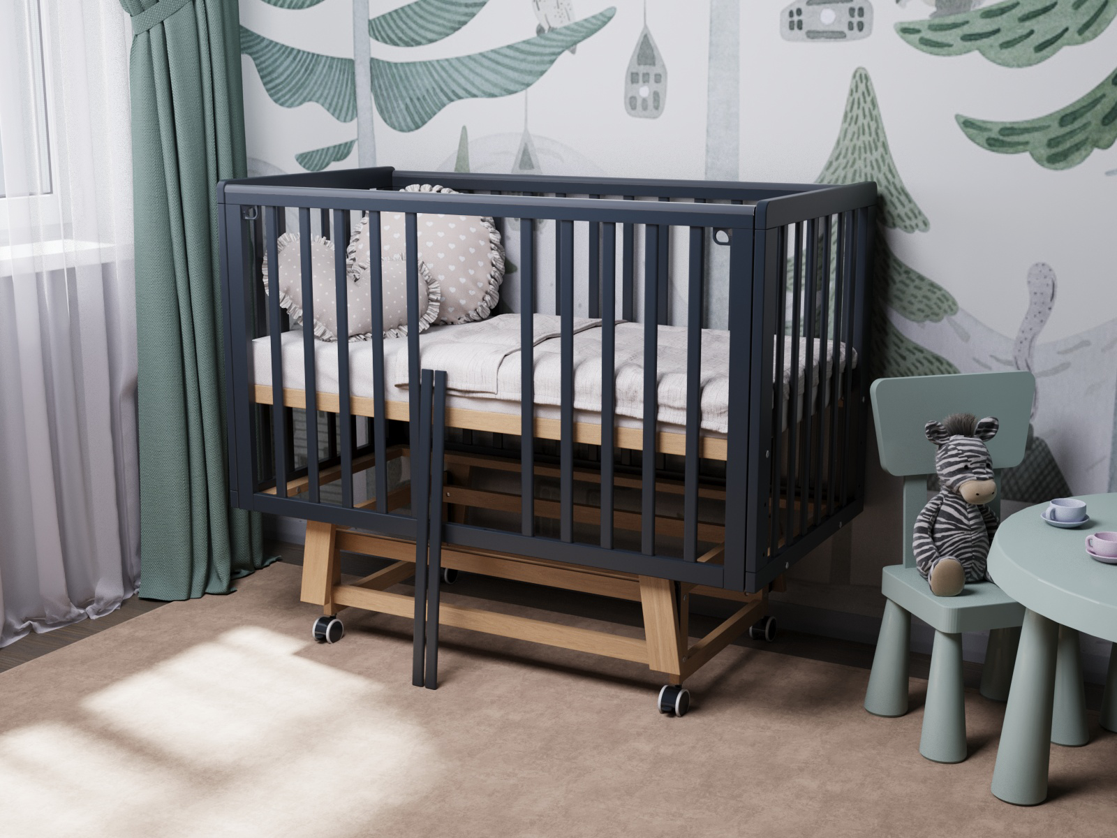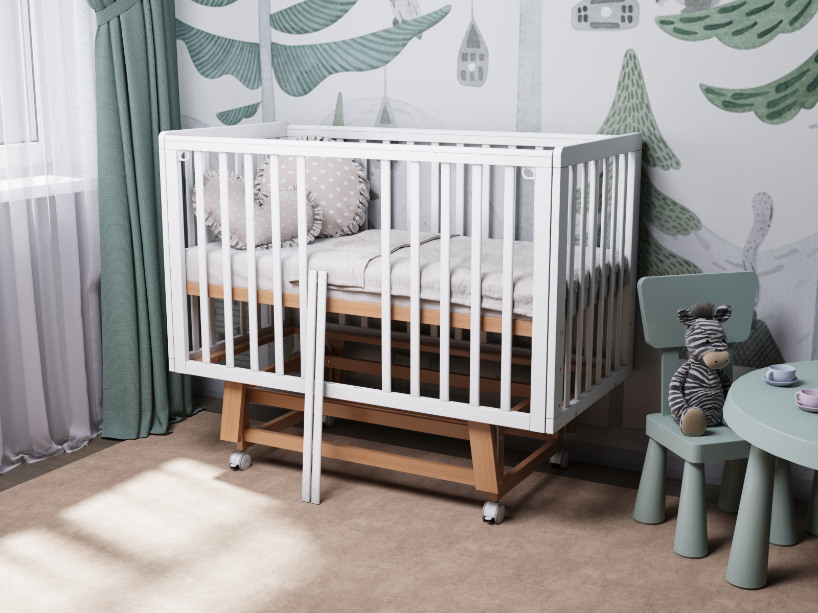 Быстросъёмная боковая стенка «Автостенка» — легкое снятие или опускание обеспечивает удобство использования и позволяет использовать кроватку как приставную к родительской кровати.