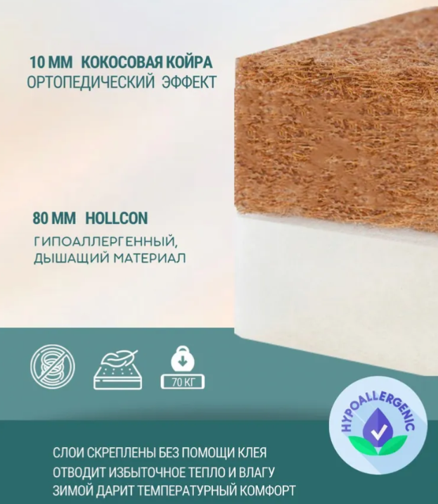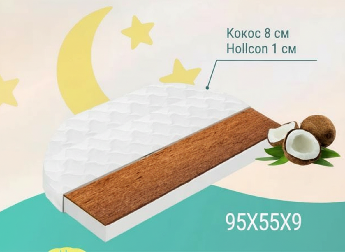 Слой латексированной кокосовой койры толщиной 10 мм создает необходимую упругость для правильного формирования позвоночника младенца. Кокосовое волокно — натуральный экологичный материал, который не гниет, отлично вентилируется и препятствует размножению бактерий и пылевых клещей.