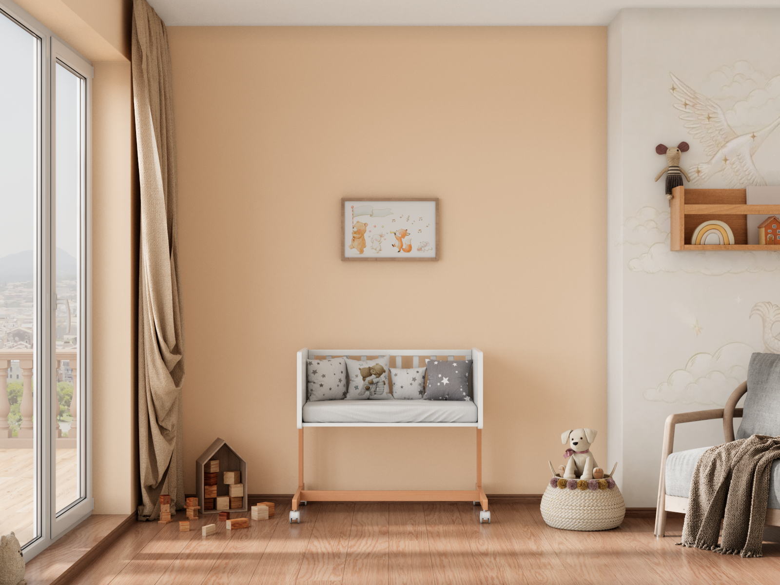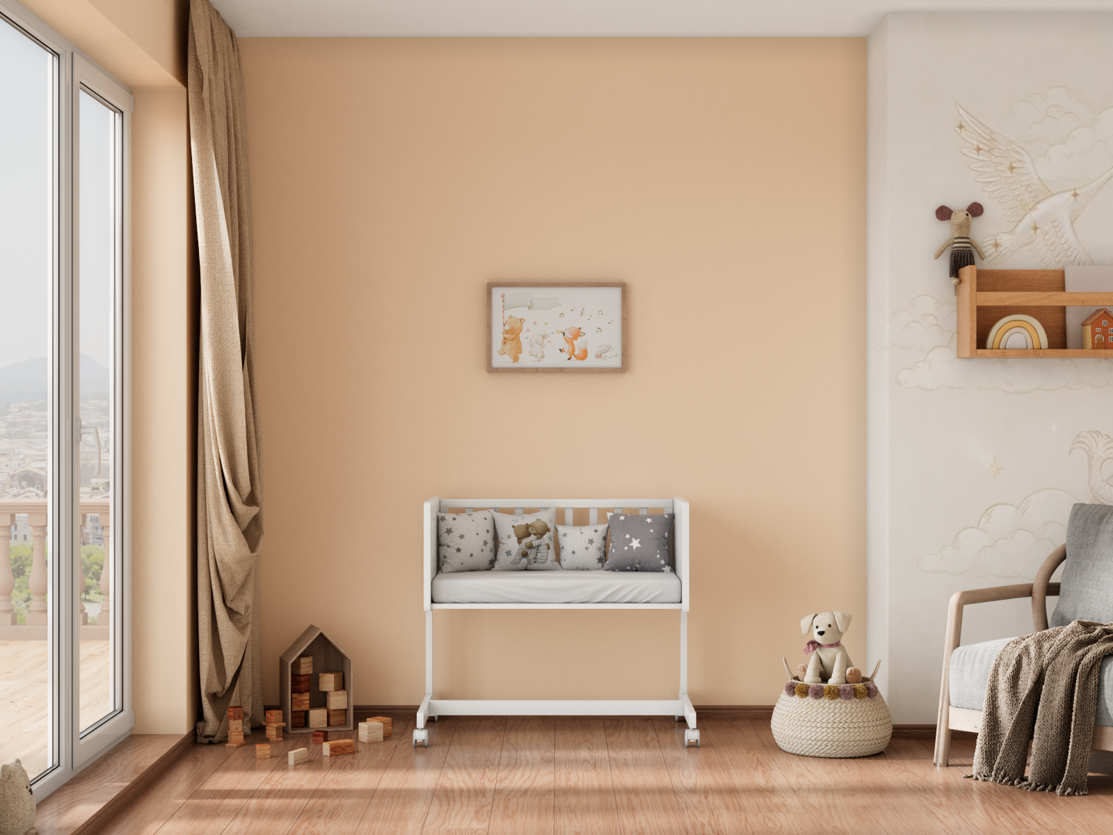 - Приставная колыбель с креплением к родительской кровати. Передняя стенка снимается полностью или частично (состоит из двух решеток).
