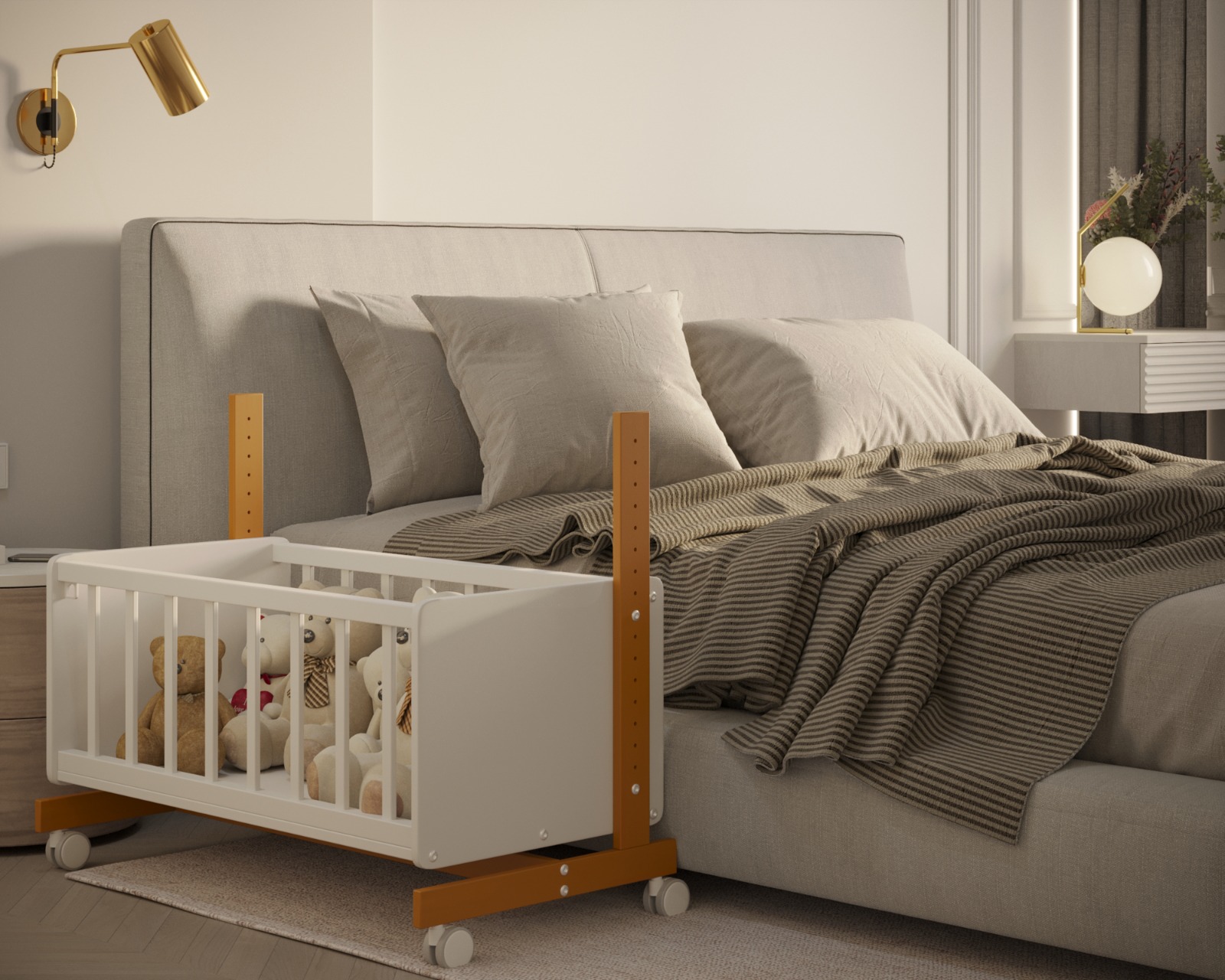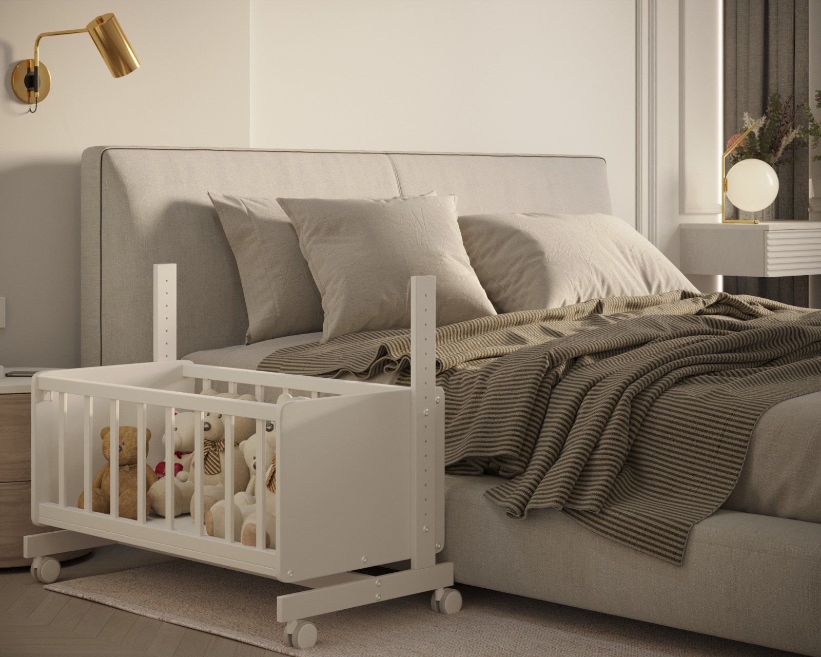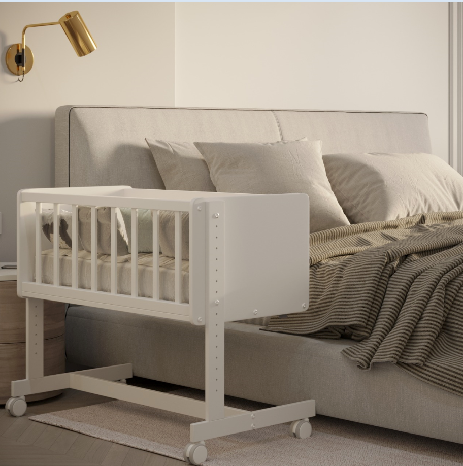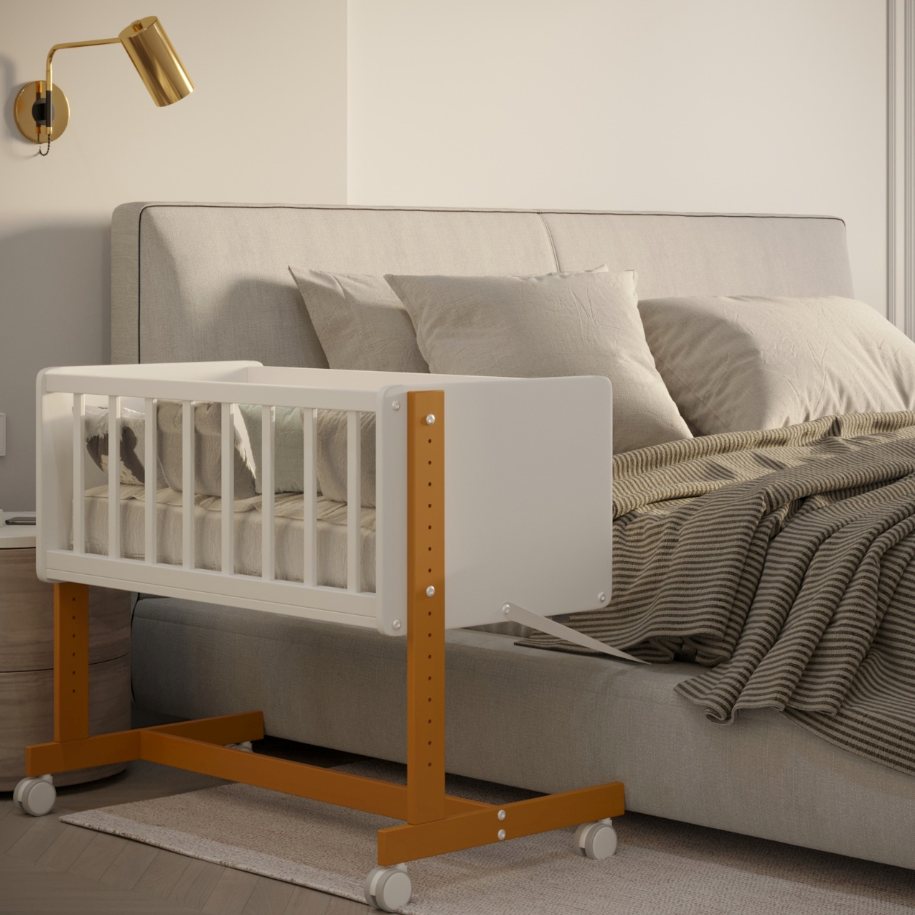 Кроме того, для дополнительного удобства модель оборудована прорезиненными колесами со стопорами. Специальные ремни обеспечивают крепление к родительской кровати.