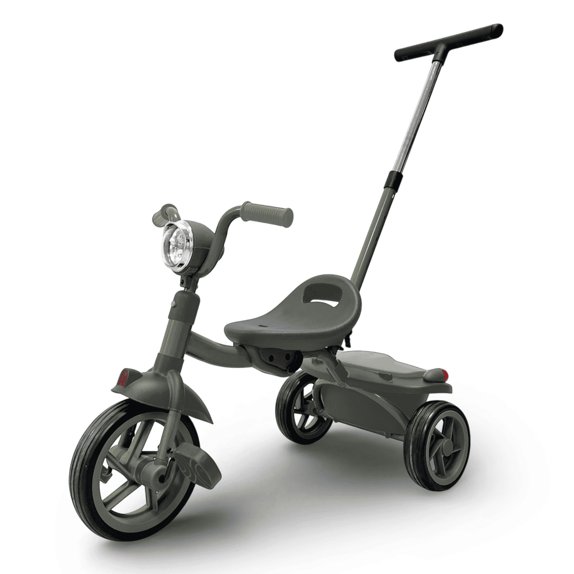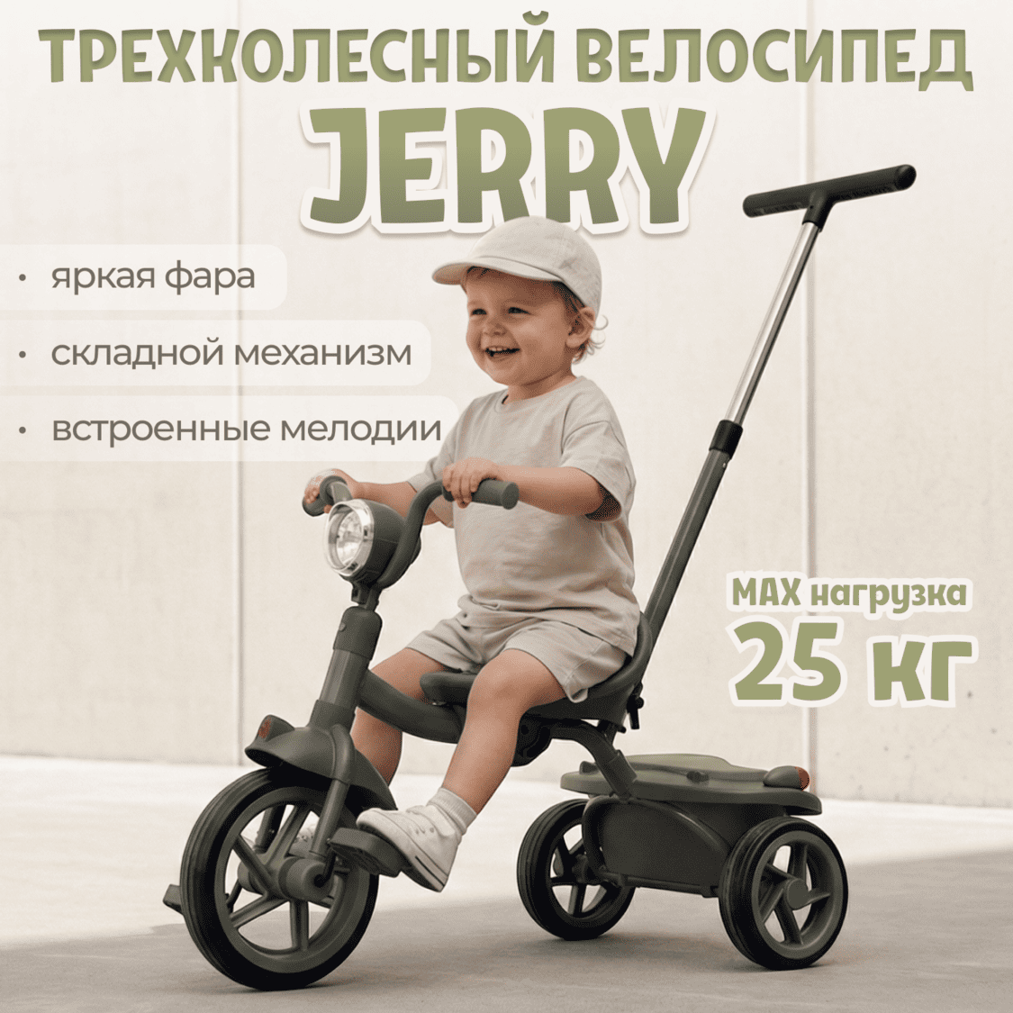 Легкий складной трехколесный велосипед BubaGO Jerry для детей 1,5–3 лет с мягкими EVA‑колесами, регулируемым сиденьем, съемной родительской ручкой и музыкальной фарой — для комфортных и безопасных прогулок.