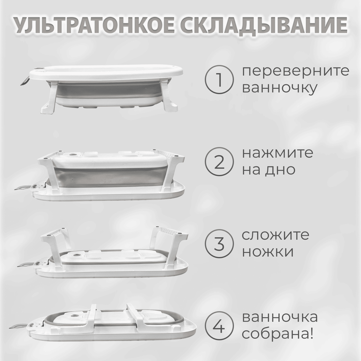 Складная конструкция: ванночка раскладывается и складывается за несколько секунд, подходит для небольших ванных комнат и квартир.