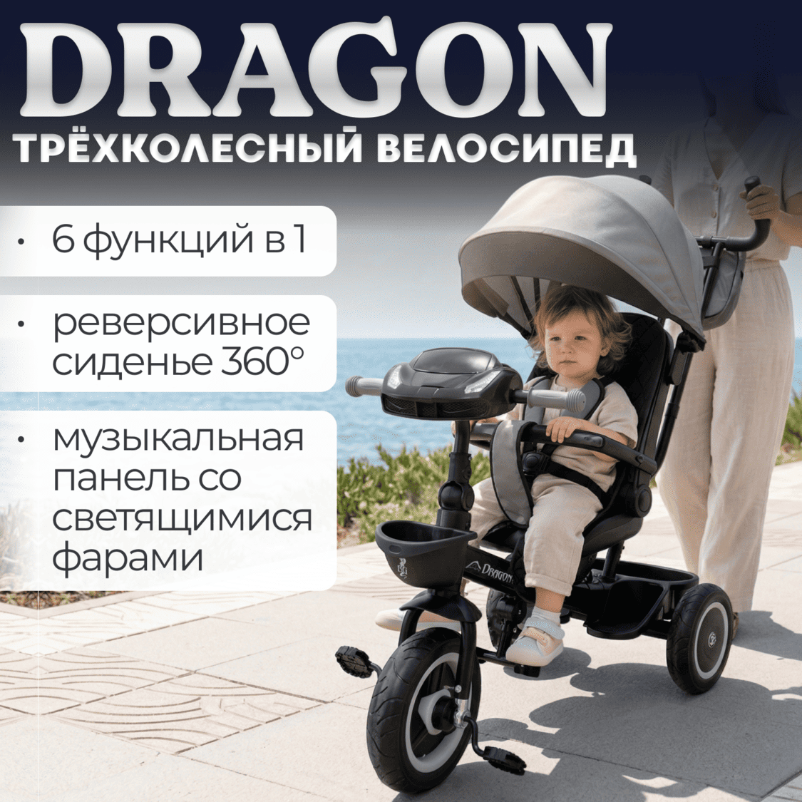 Велосипед‑трансформер BubaGO Dragon 6 в 1 с реверсивным сиденьем 360°, полиуретановыми колесами и музыкальной панелью (USB/Bluetooth/AUX) подходит детям от 6 месяцев, обеспечивая комфортные и безопасные прогулки, а также трансформацию в спальное место для малыша.