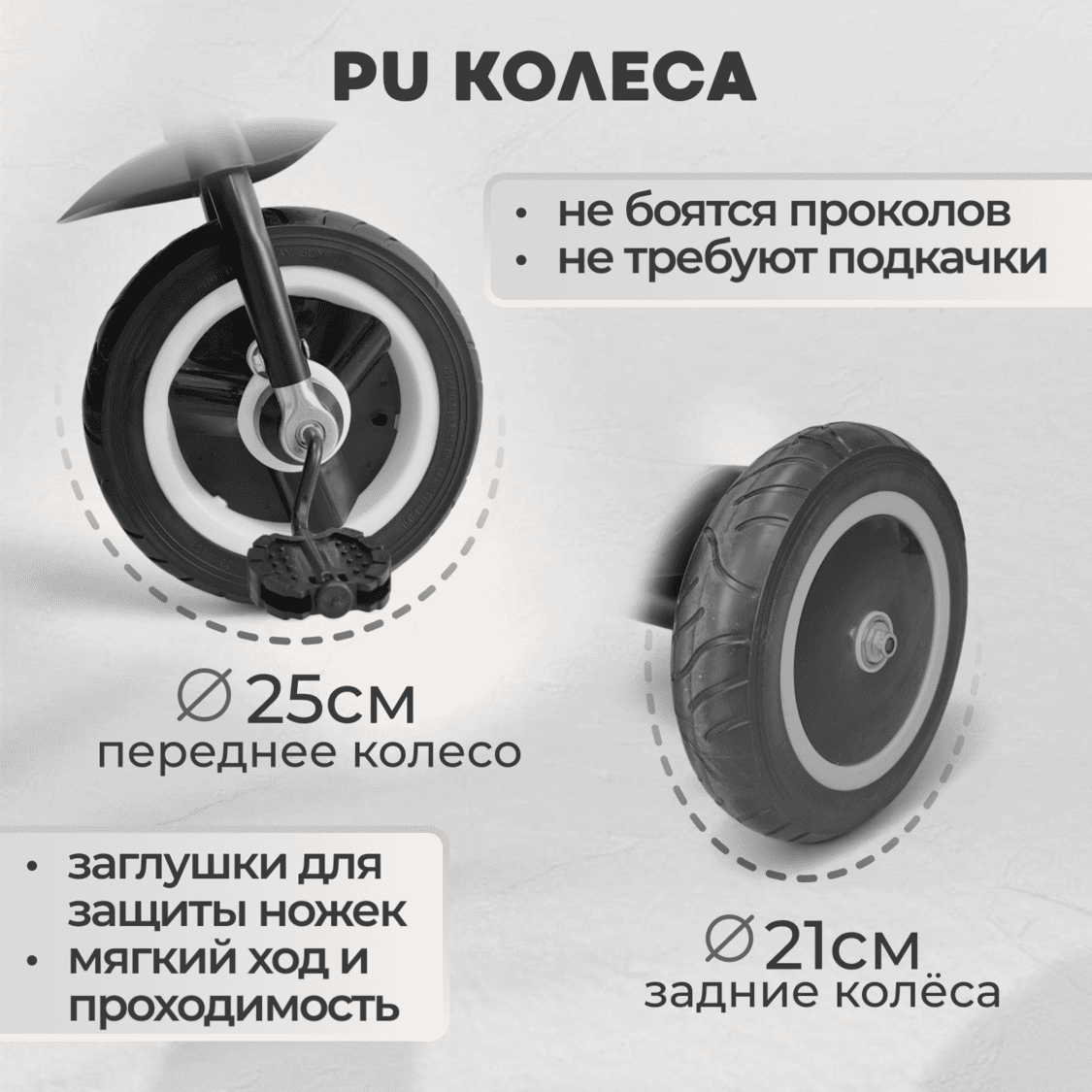 • Задние колеса: быстросъемные, диаметр 21 см — удобно для хранения и транспортировки.
