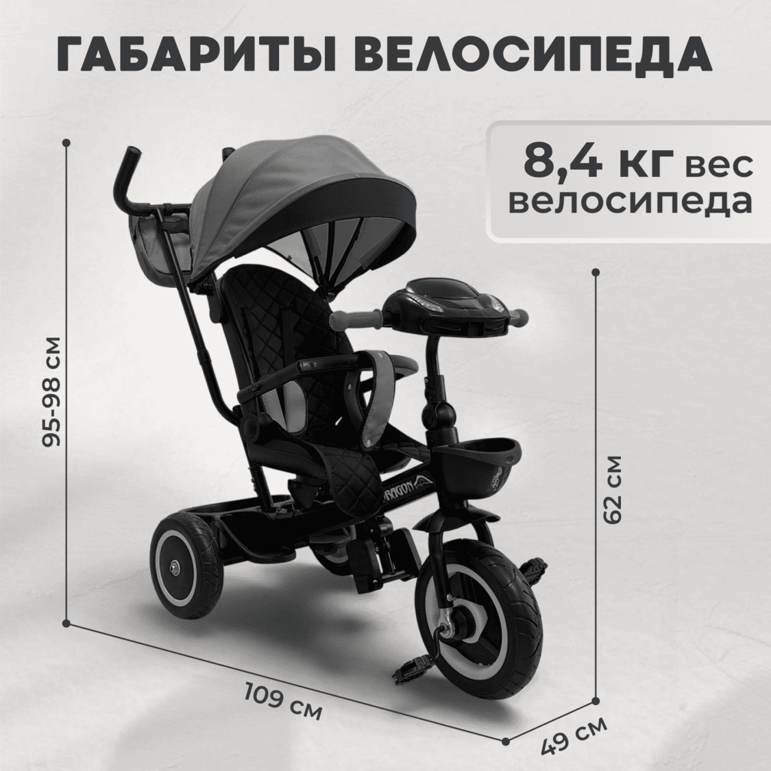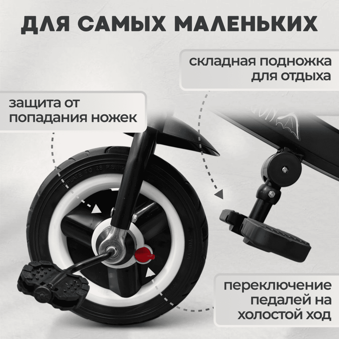 • Переднее колесо: диаметр 25 см, есть переключатель холостого хода педалей — ребенок может просто ехать, пока крутите вы.
