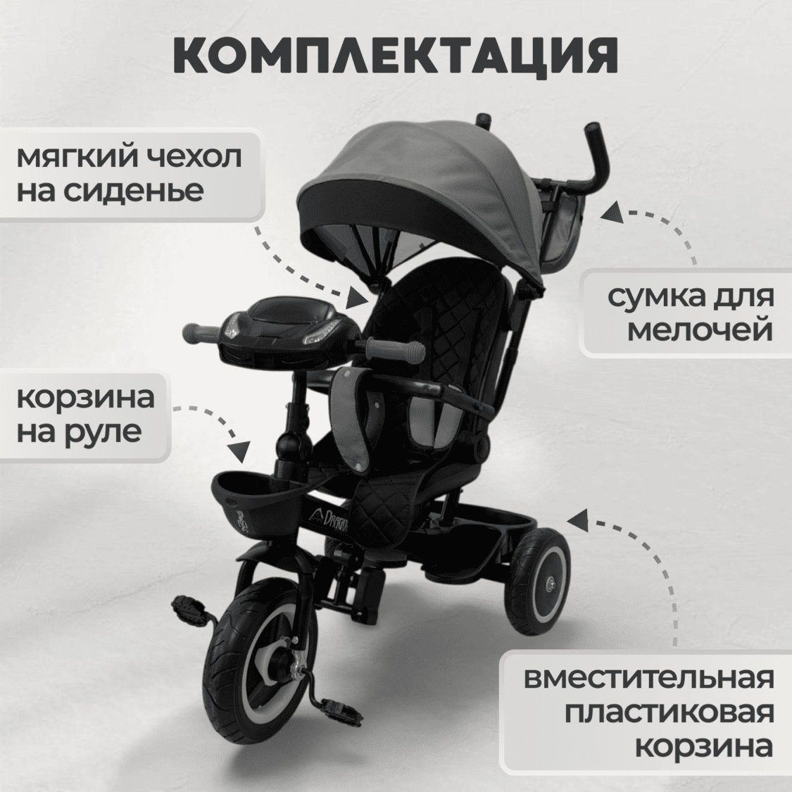 • Просторная багажная корзина для покупок и игрушек, плюс дополнительная корзинка на руле для малыша.