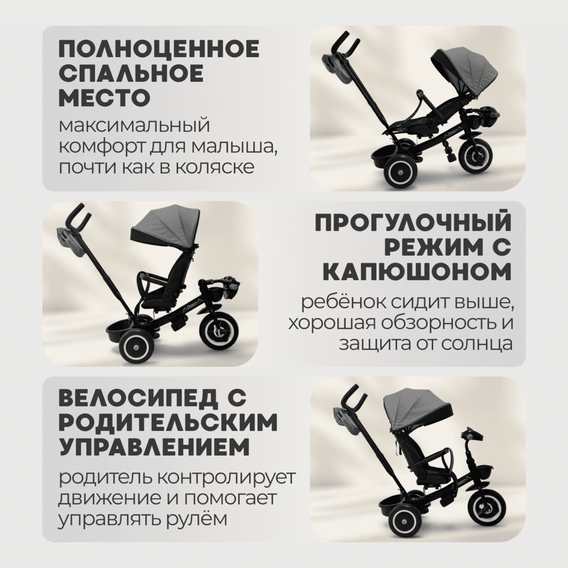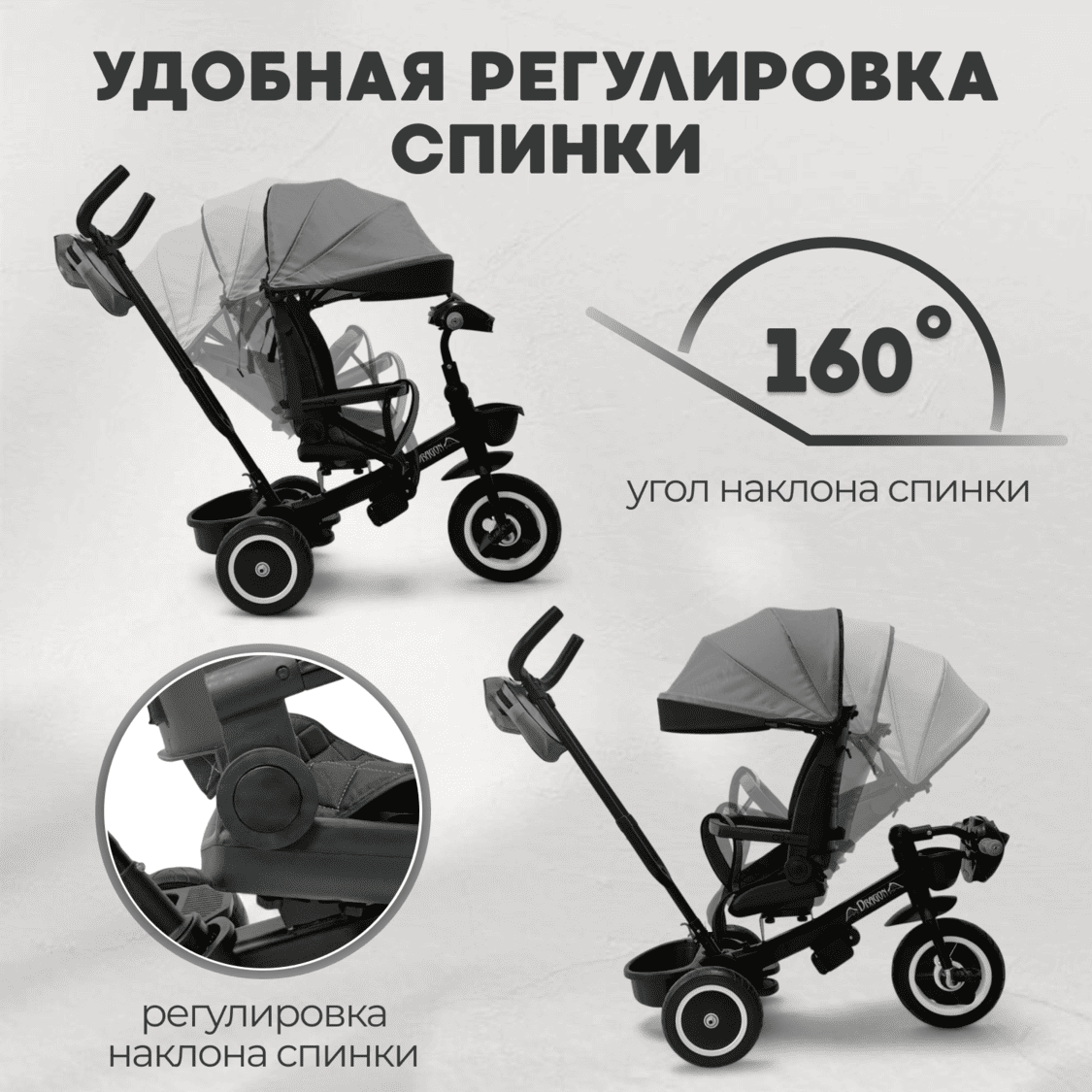 • Регулируемая родительская ручка (3 положения) обеспечивает комфортное управление родителям разного роста.