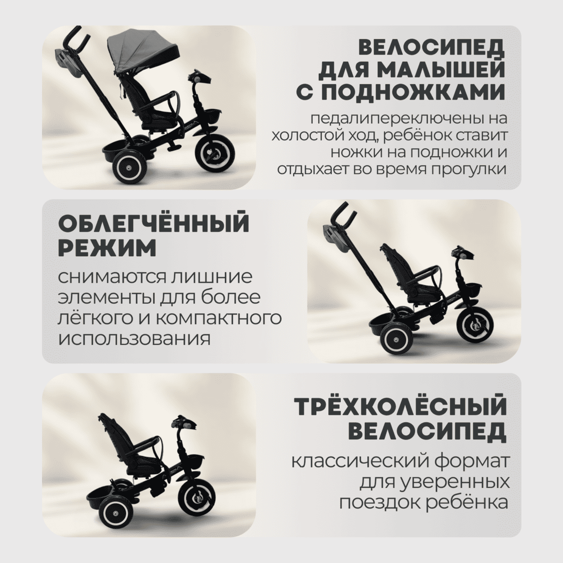 • 6-в-1: от удобного транспорта для малышей 6+ месяцев до классического трехколесного велосипеда для подросшего ребенка.