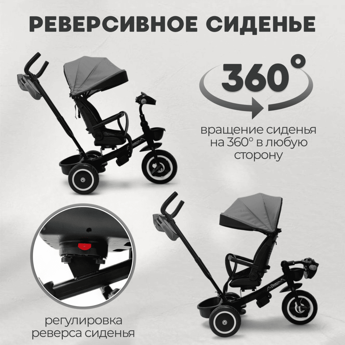 • Сиденье: реверсивное 360°, широкое (29 см)