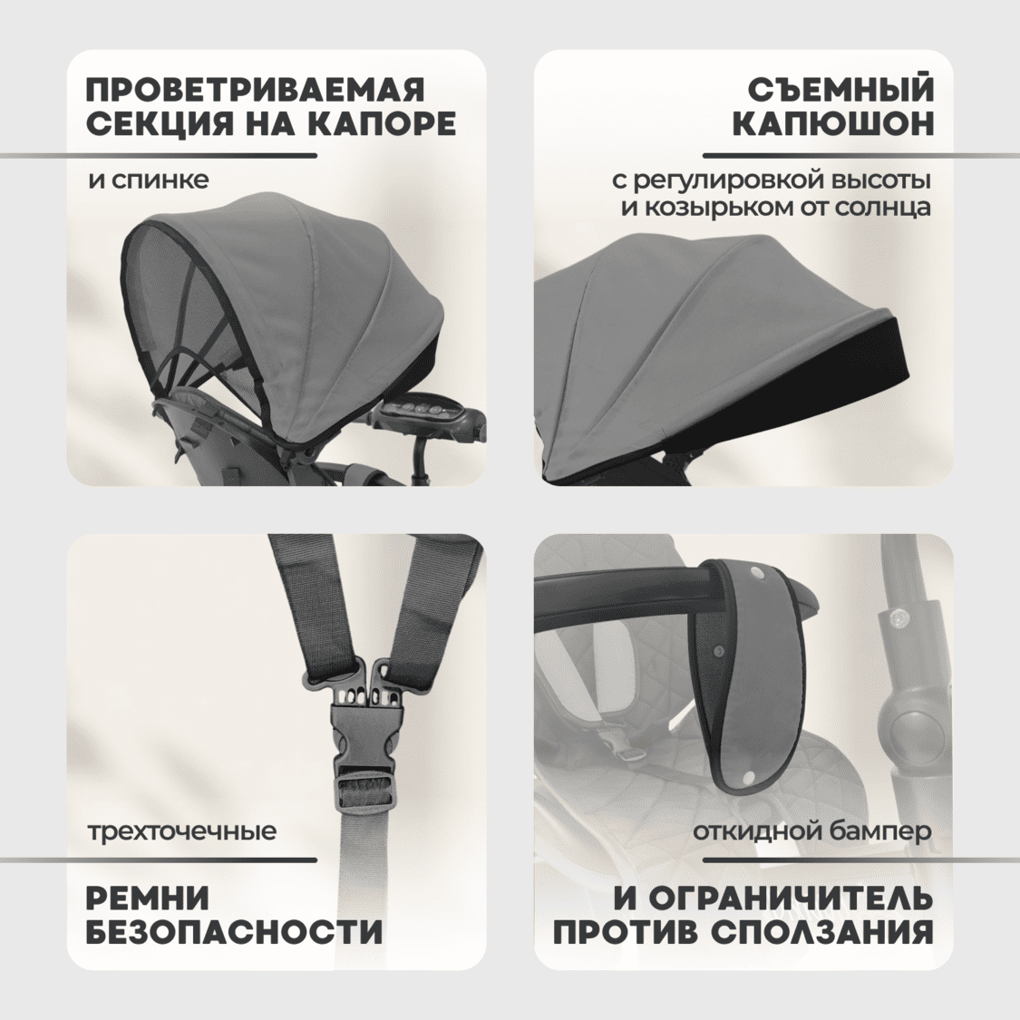 • Глубокий съемный капюшон с несколькими секциями надежно защищает малыша от солнца; козырек можно подвернуть внутрь при необходимости.
