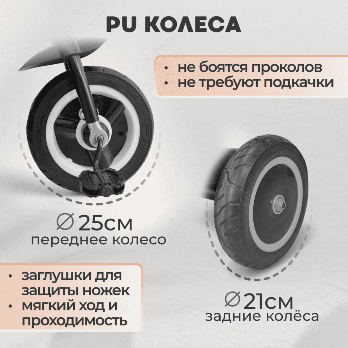 • Переднее колесо: диаметр 25 см, есть переключатель холостого хода педалей — ребенок может просто ехать, пока крутите вы.